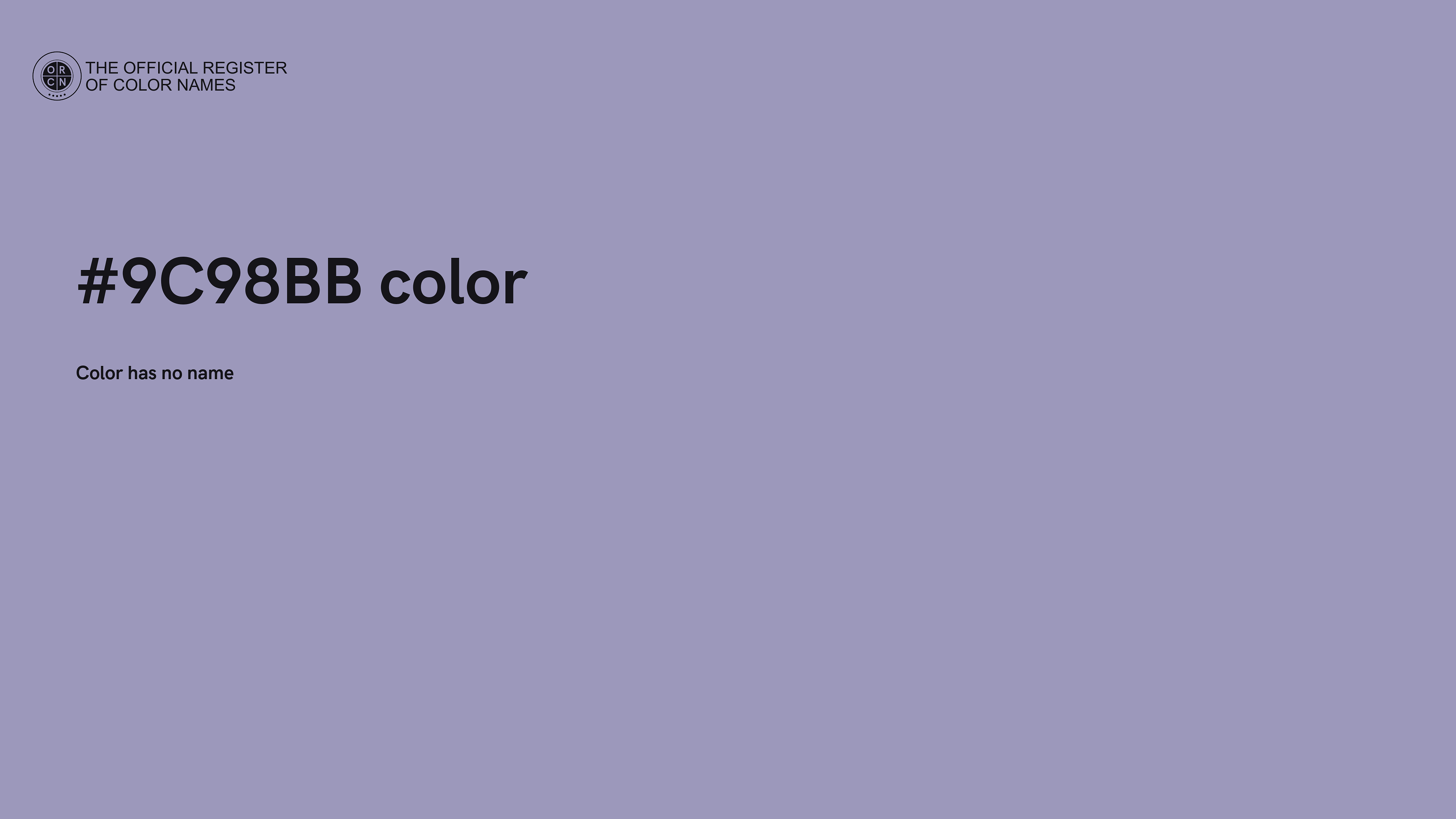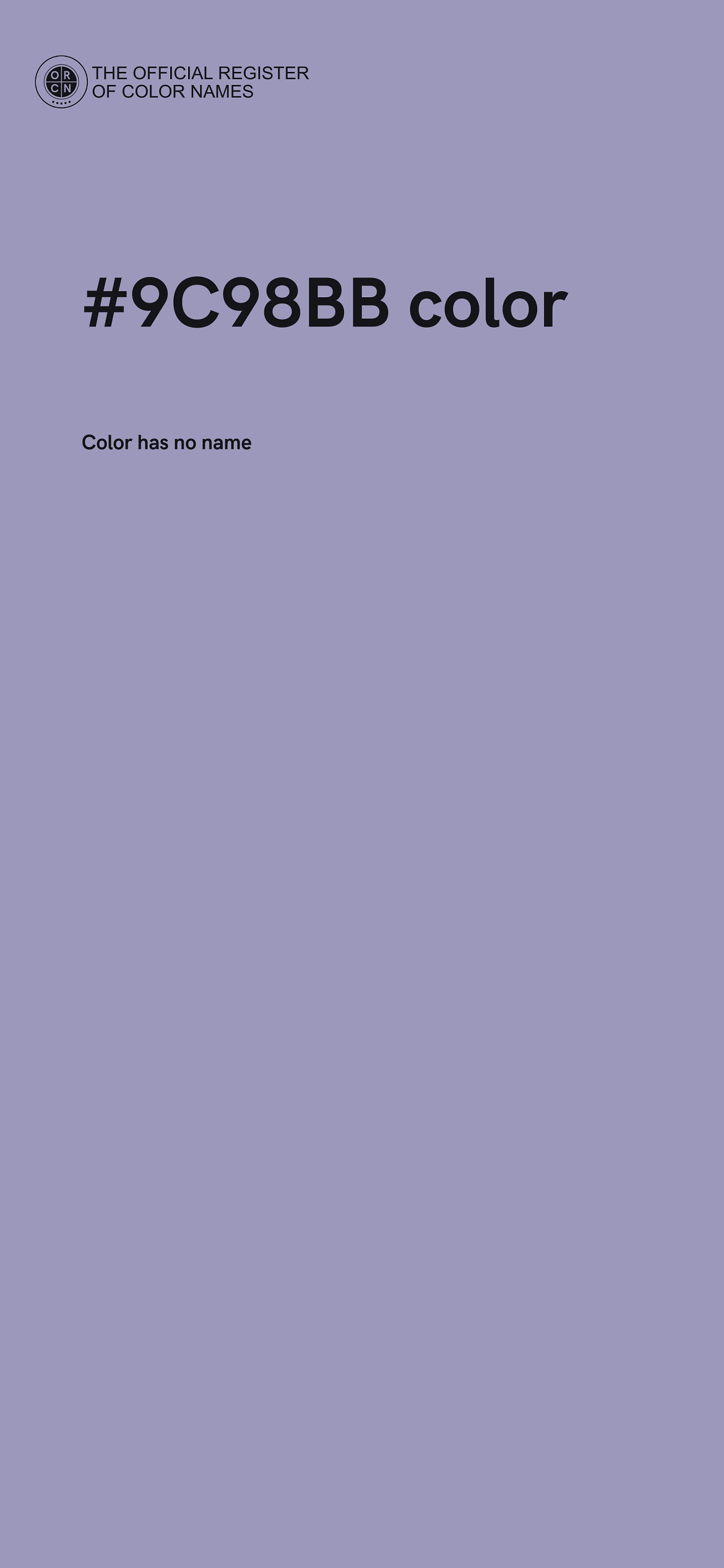 The digital color HEX #9C98BB belongs to the Blue Color Family featuring Low Saturation (Saturation Family) and Very Light (Brightness Family).