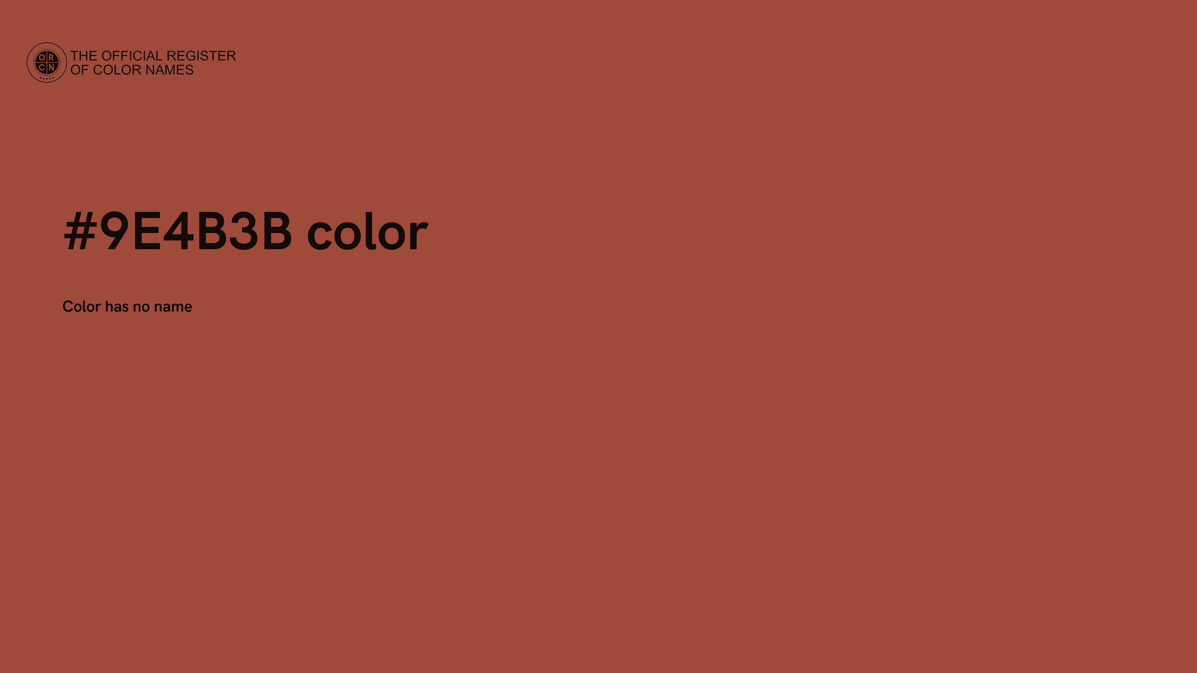 The digital color HEX #9E4B3B belongs to the Red Color Family featuring Moderate Saturation (Saturation Family) and Light (Brightness Family).