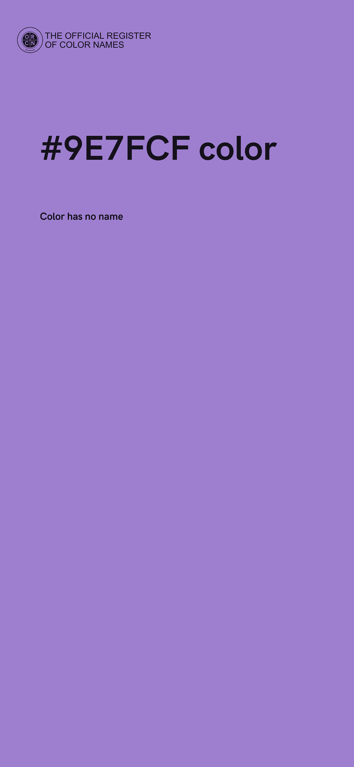 The digital color HEX #9E7FCF belongs to the Violet Color Family featuring Moderate Saturation (Saturation Family) and Very Light (Brightness Family).