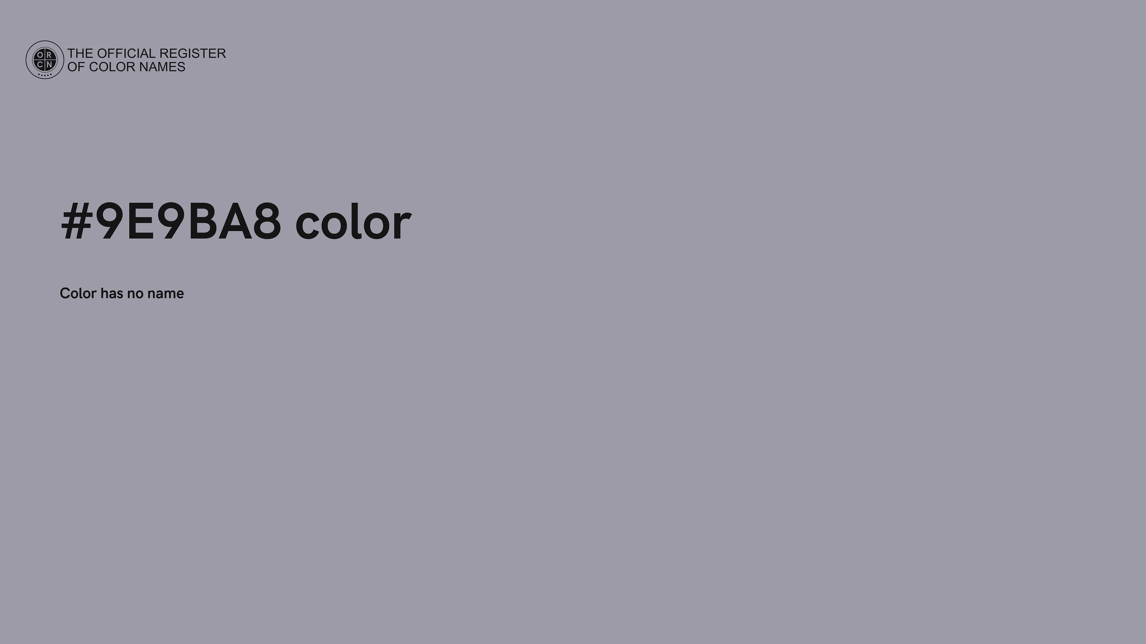 The digital color HEX #9E9BA8 belongs to the Blue Color Family featuring Desaturated (Saturation Family) and Very Light (Brightness Family).