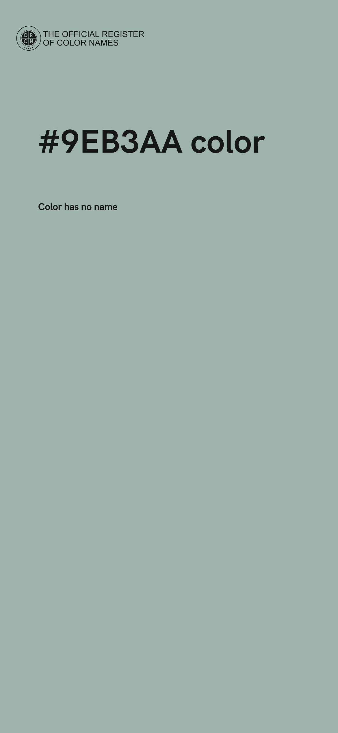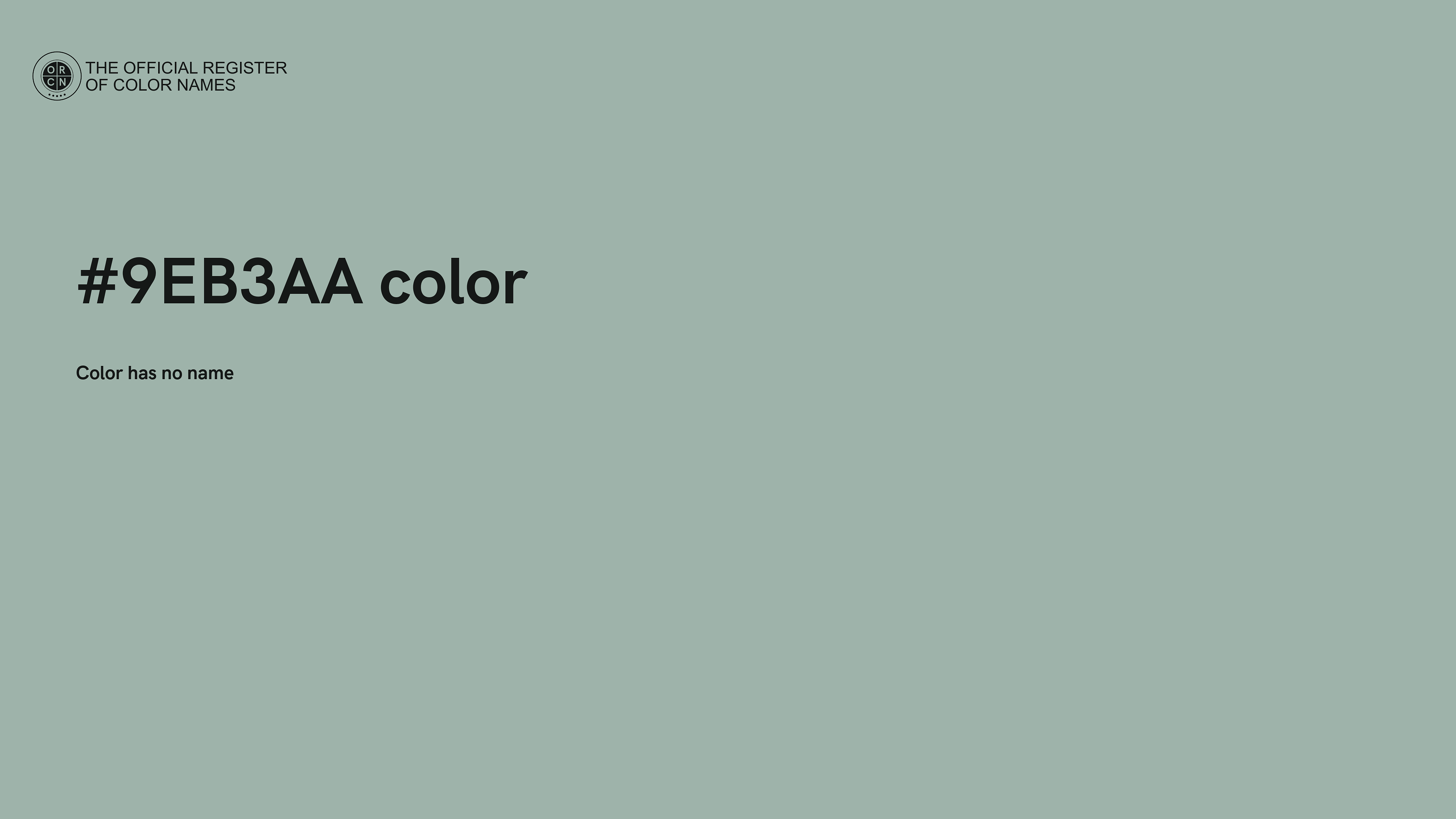 The digital color HEX #9EB3AA belongs to the Spring Green Color Family featuring Low Saturation (Saturation Family) and Very Light (Brightness Family).