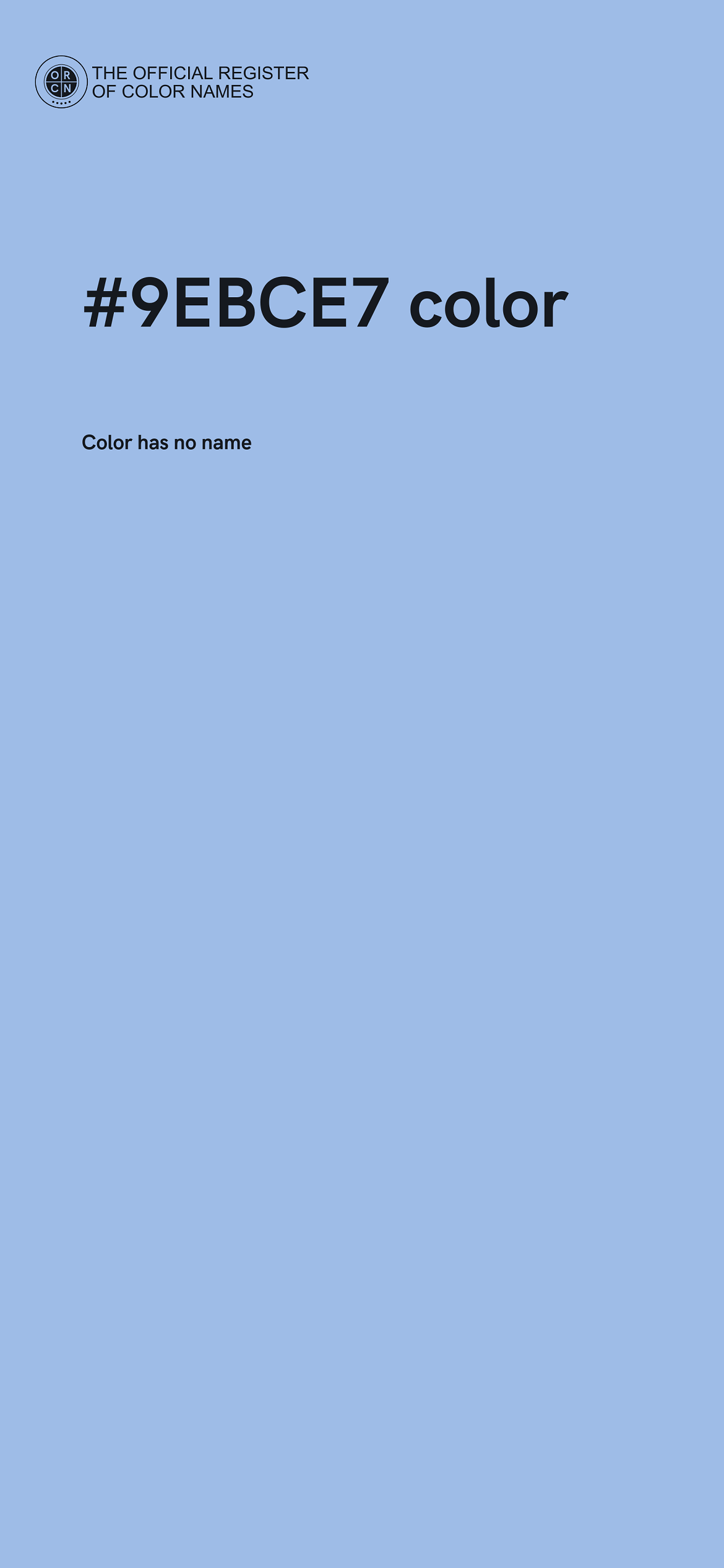 The digital color HEX #9EBCE7 belongs to the Azure Color Family featuring High Saturation (Saturation Family) and Very Light (Brightness Family).