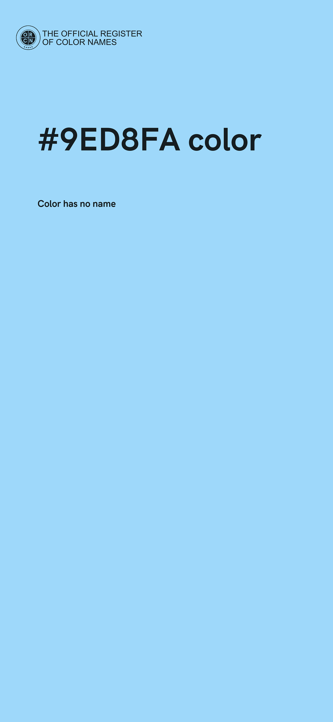 The digital color HEX #9ED8FA belongs to the Azure Color Family featuring Full Saturation (Saturation Family) and Very Light (Brightness Family).