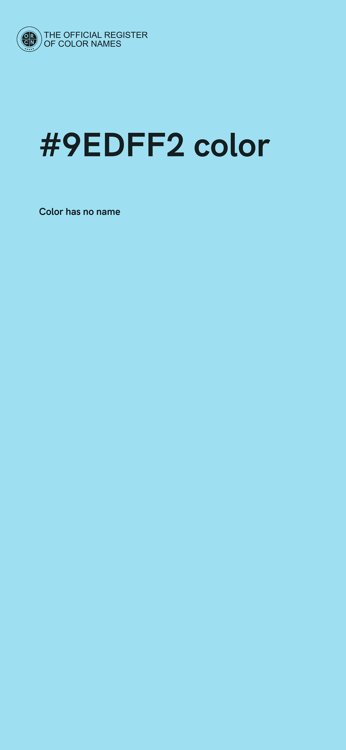 The digital color HEX #9EDFF2 belongs to the Cyan Color Family featuring High Saturation (Saturation Family) and Very Light (Brightness Family).