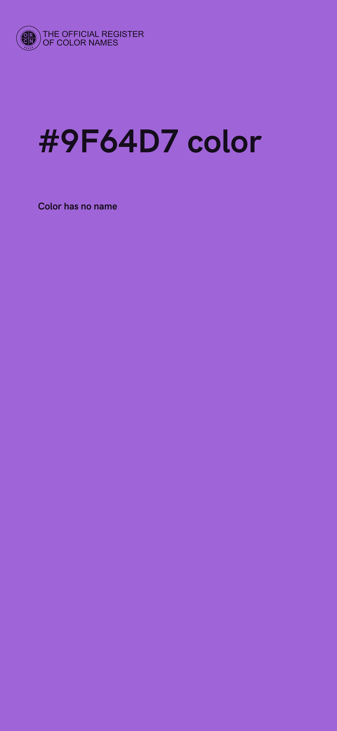 The digital color HEX #9F64D7 belongs to the Violet Color Family featuring Moderate Saturation (Saturation Family) and Very Light (Brightness Family).