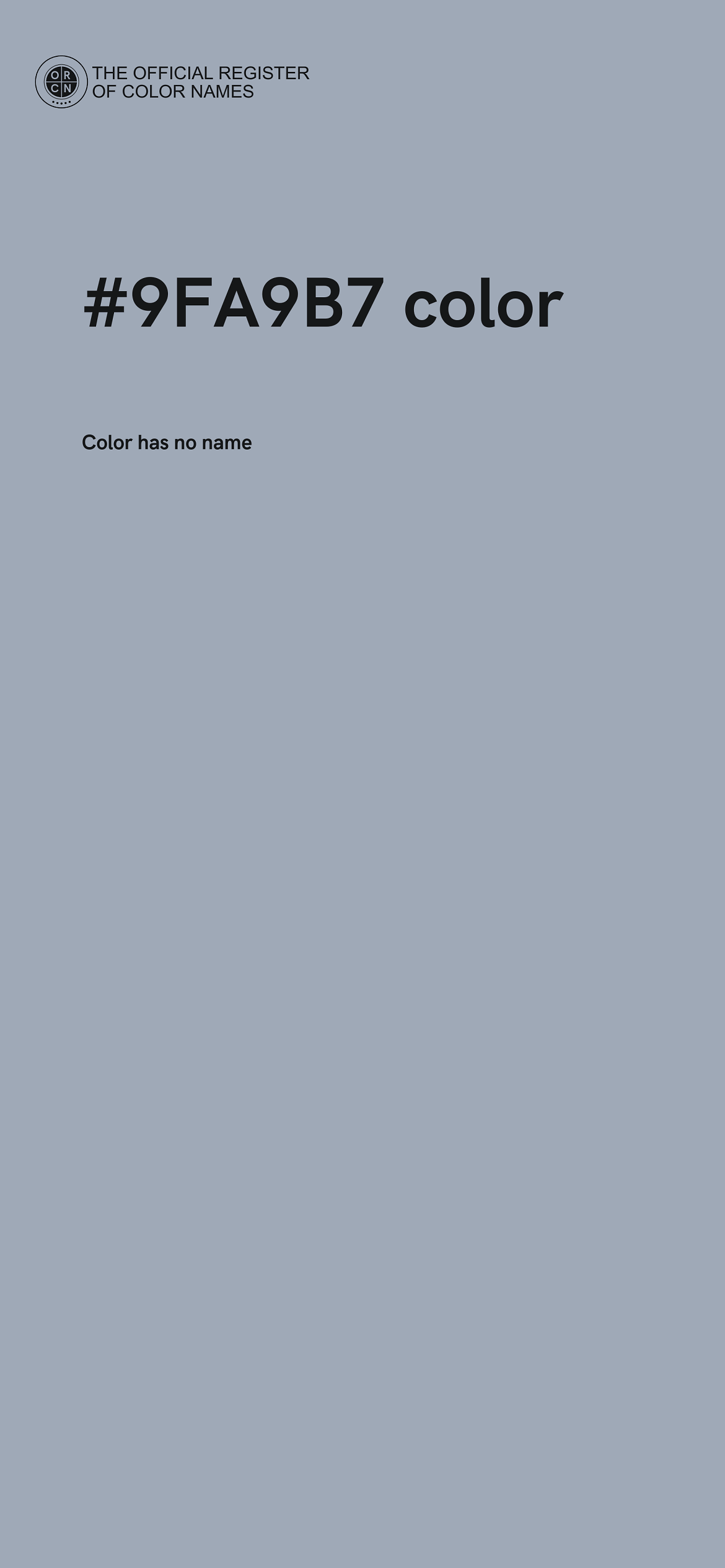 The digital color HEX #9FA9B7 belongs to the Azure Color Family featuring Low Saturation (Saturation Family) and Very Light (Brightness Family).