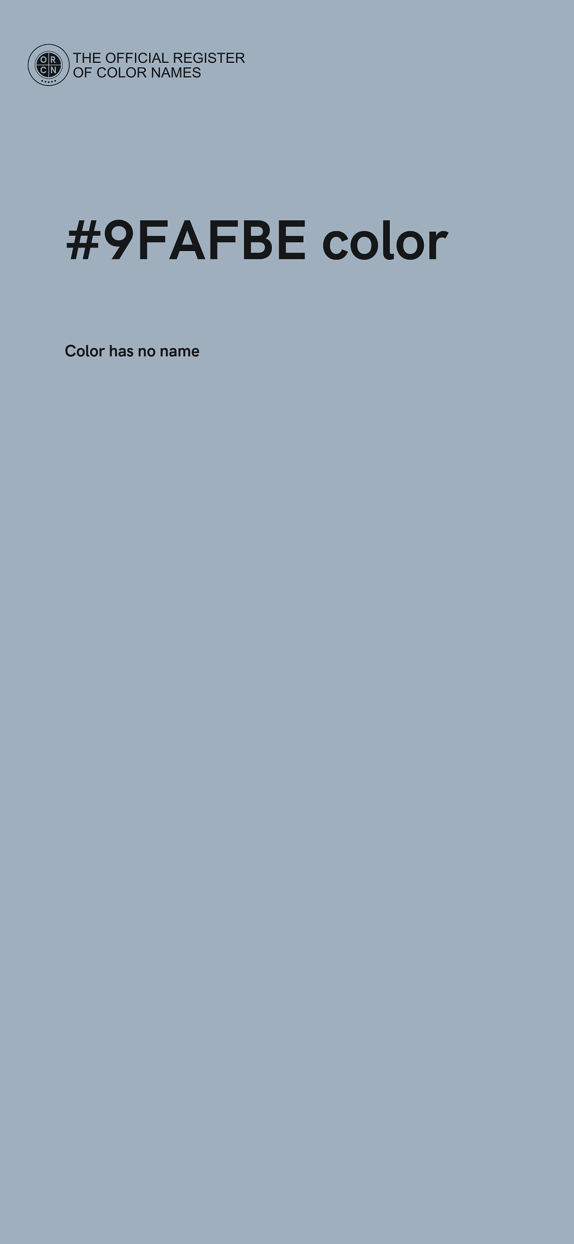 The digital color HEX #9FAFBE belongs to the Azure Color Family featuring Low Saturation (Saturation Family) and Very Light (Brightness Family).