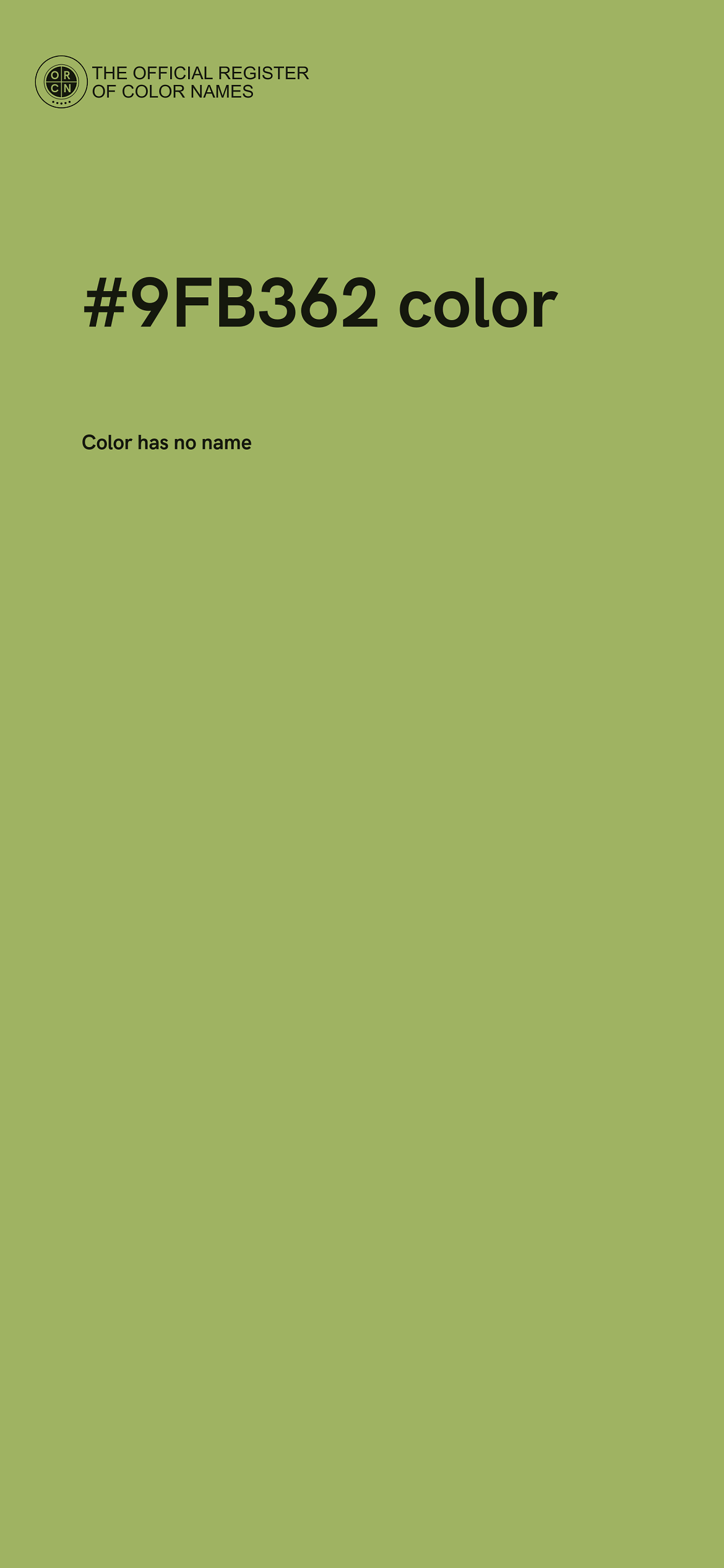 The digital color HEX #9FB362 belongs to the Chartreuse Color Family featuring Mild Saturation (Saturation Family) and Light (Brightness Family).