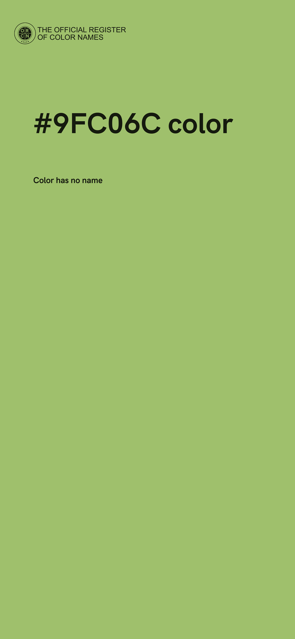 The digital color HEX #9FC06C belongs to the Chartreuse Color Family featuring Moderate Saturation (Saturation Family) and Light (Brightness Family).