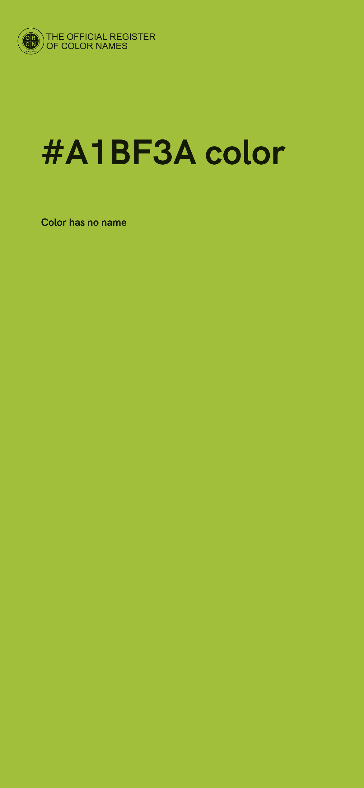 For printing in non digital world, #A1BF3A is represented in CMYK as 12 Cyan, 0 Magenta, 52 Yellow, and 25 Black (Key) (C:12 M:0 Y:52 K:25).