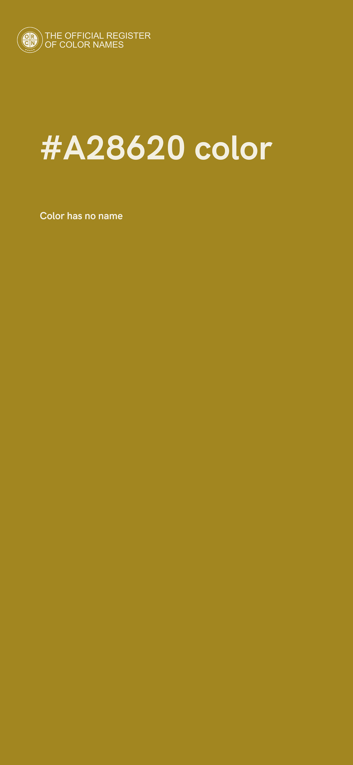 The digital color HEX #A28620 belongs to the Yellow Color Family featuring High Saturation (Saturation Family) and Neutral (Brightness Family).