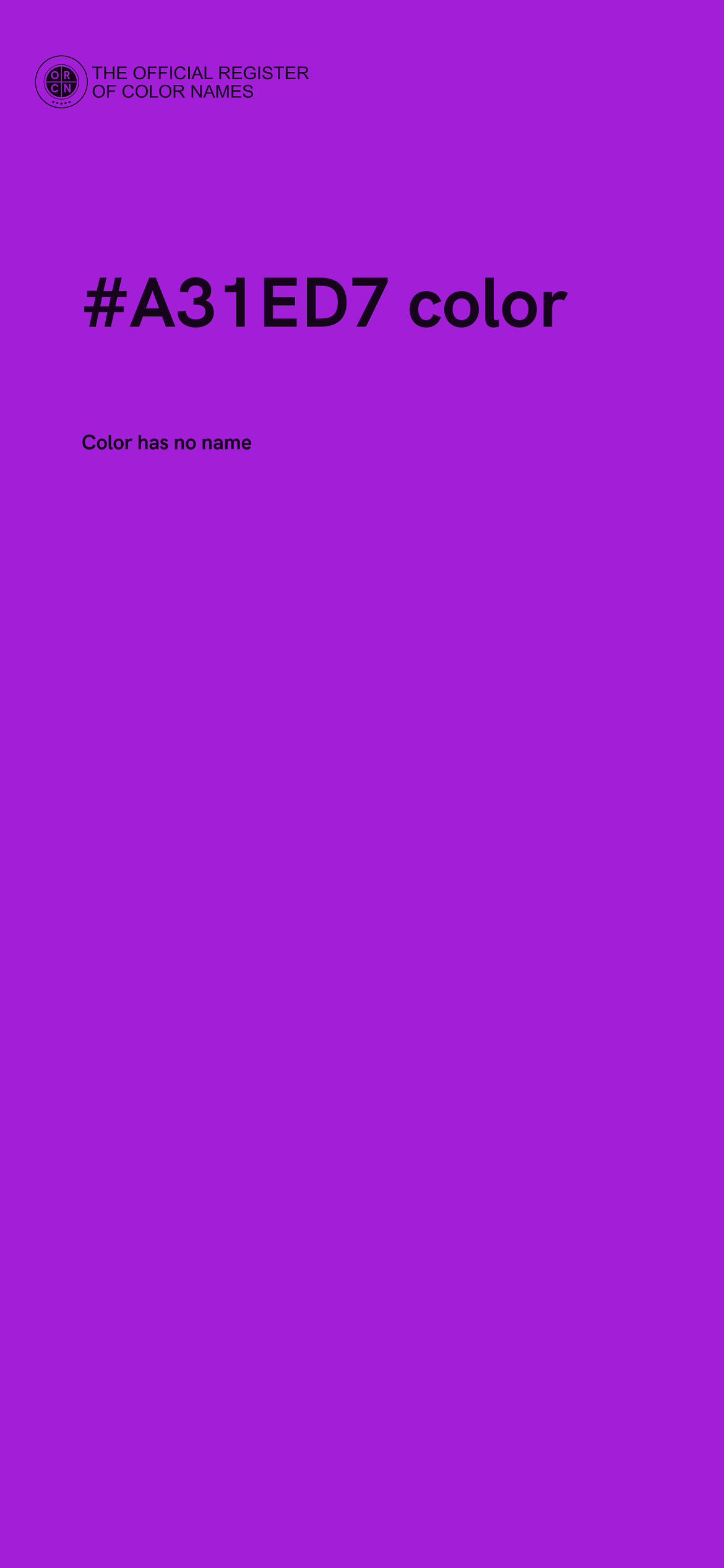 The digital color HEX #A31ED7 belongs to the Violet Color Family featuring High Saturation (Saturation Family) and Light (Brightness Family).