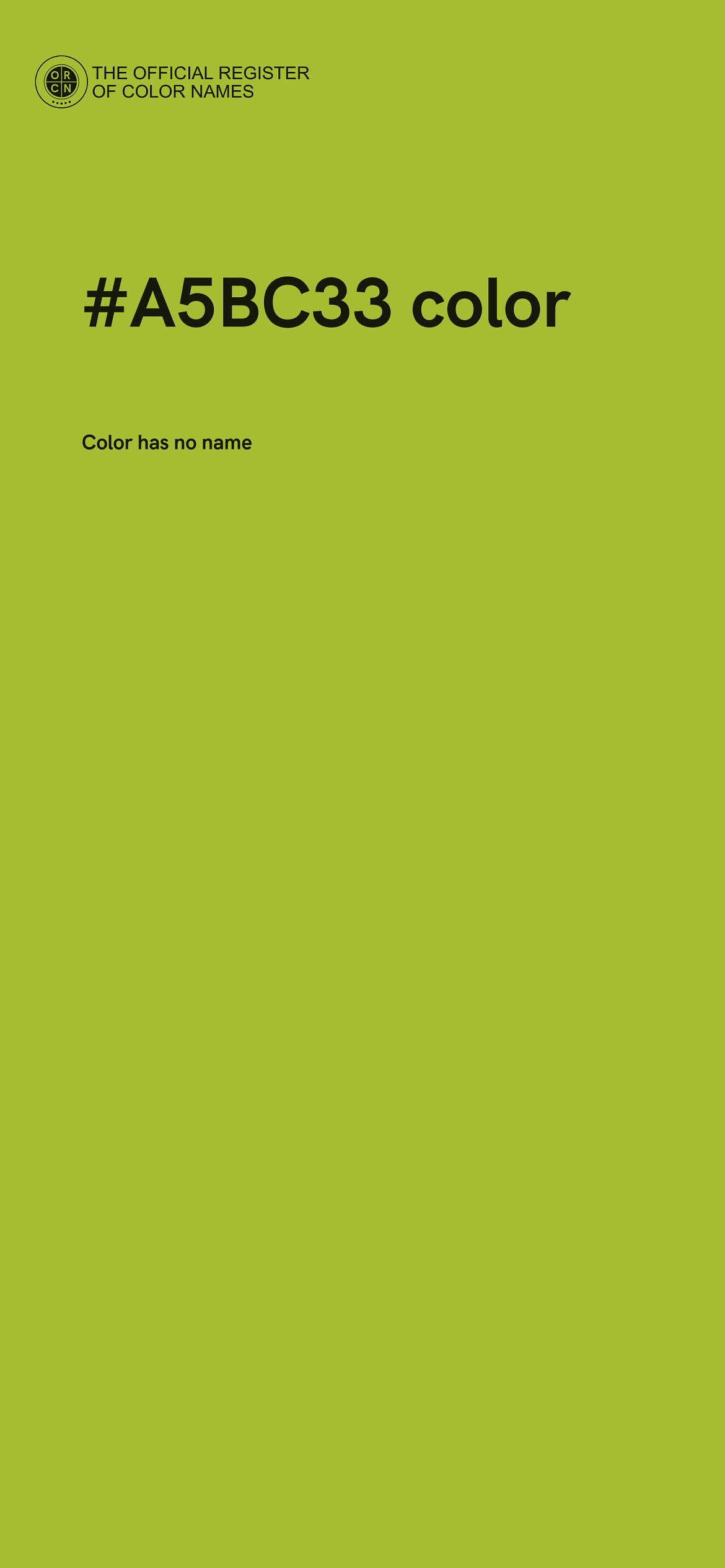 The digital color HEX #A5BC33 belongs to the Yellow Color Family featuring Moderate Saturation (Saturation Family) and Light (Brightness Family).