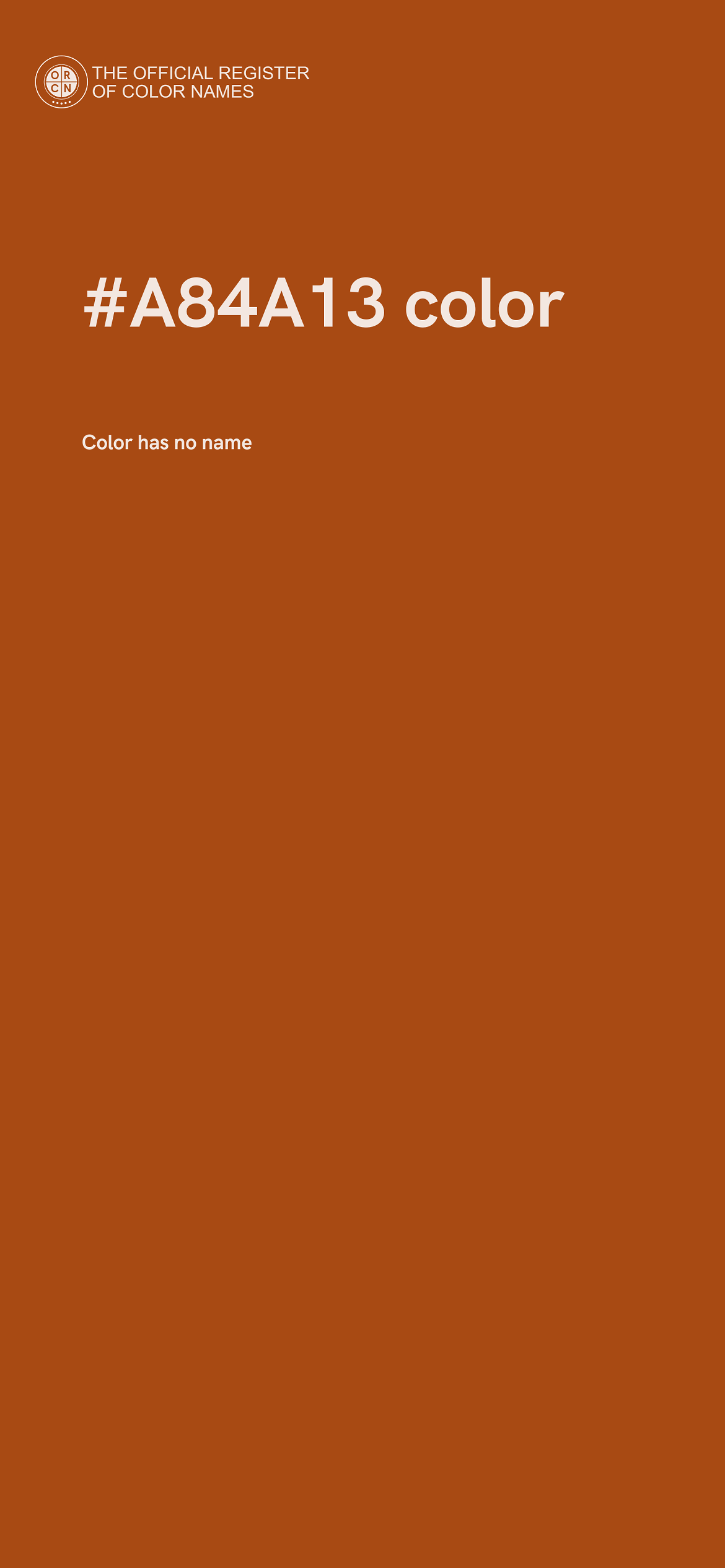 The digital color HEX #A84A13 belongs to the Orange Color Family featuring High Saturation (Saturation Family) and Neutral (Brightness Family).