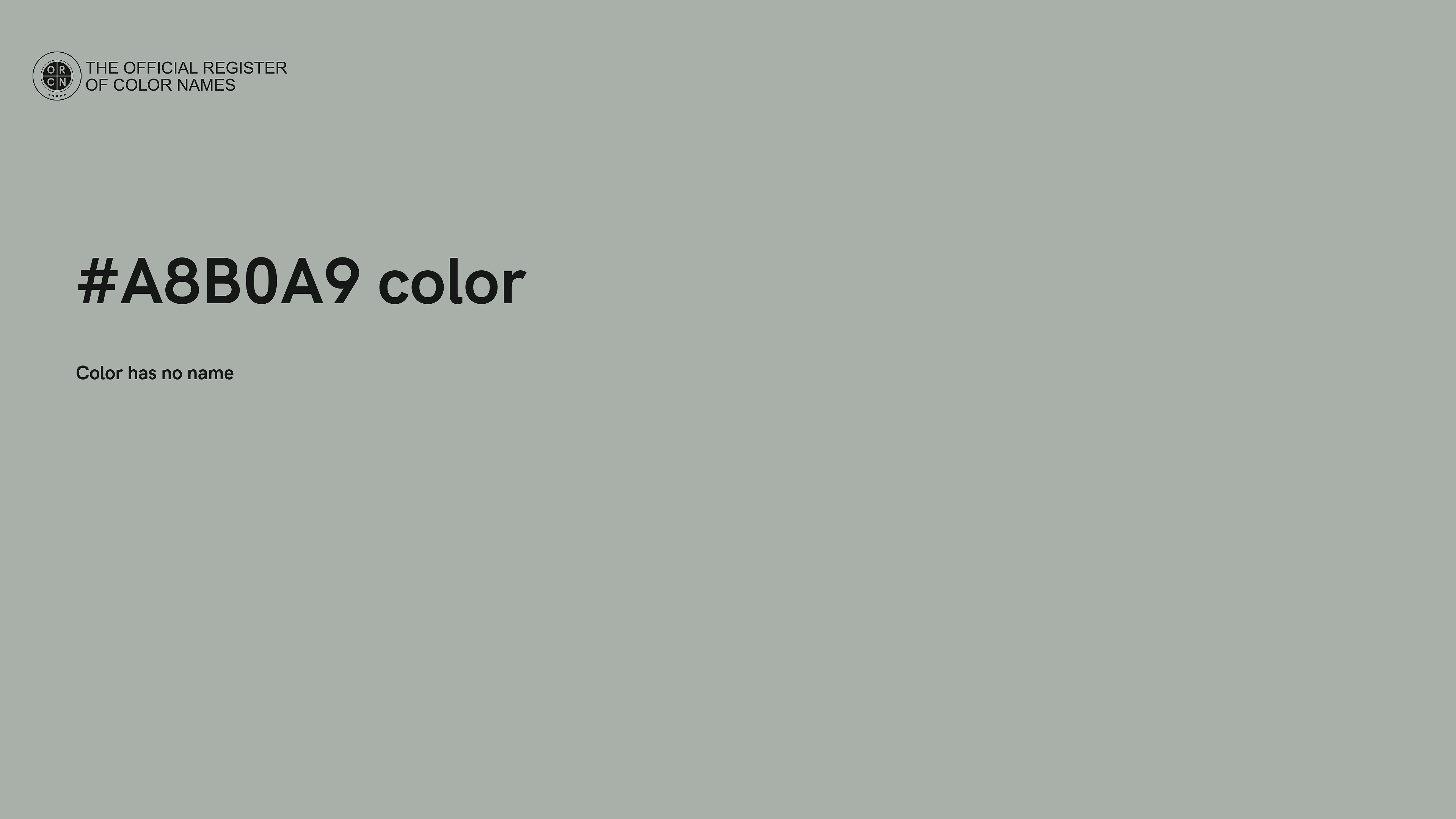 The digital color HEX #A8B0A9 belongs to the Green Color Family featuring Desaturated (Saturation Family) and Very Light (Brightness Family).