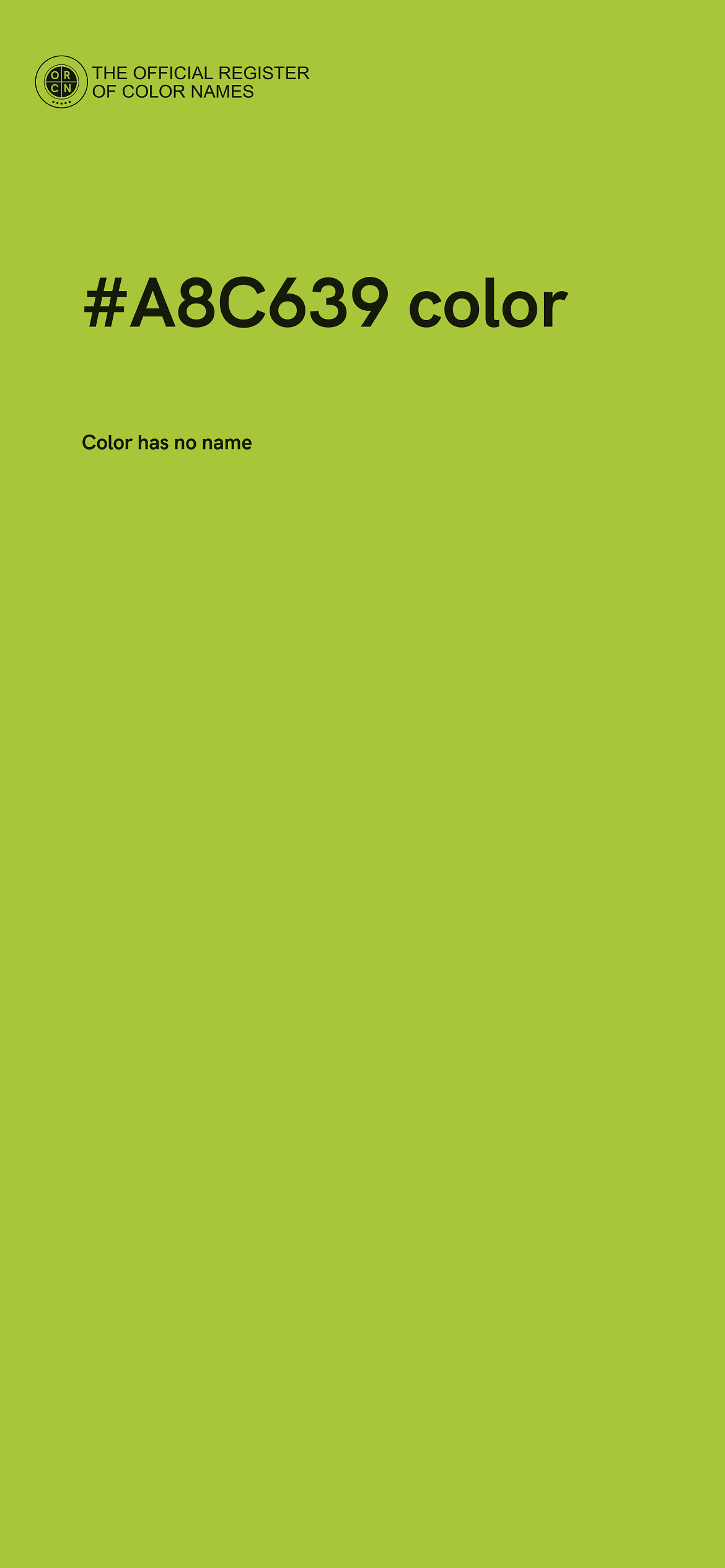 The digital color HEX #A8C639 belongs to the Yellow Color Family featuring Moderate Saturation (Saturation Family) and Light (Brightness Family).