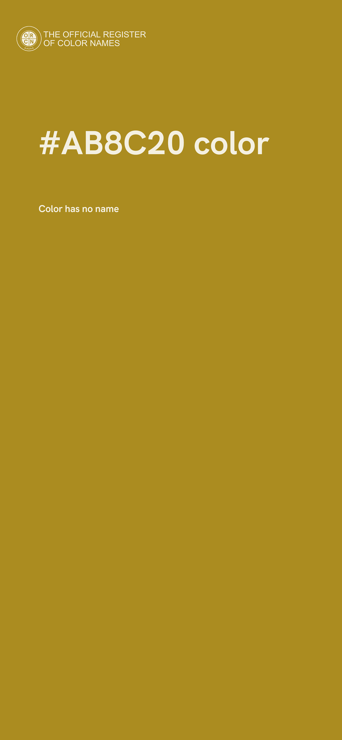 The digital color HEX #AB8C20 belongs to the Yellow Color Family featuring High Saturation (Saturation Family) and Light (Brightness Family).