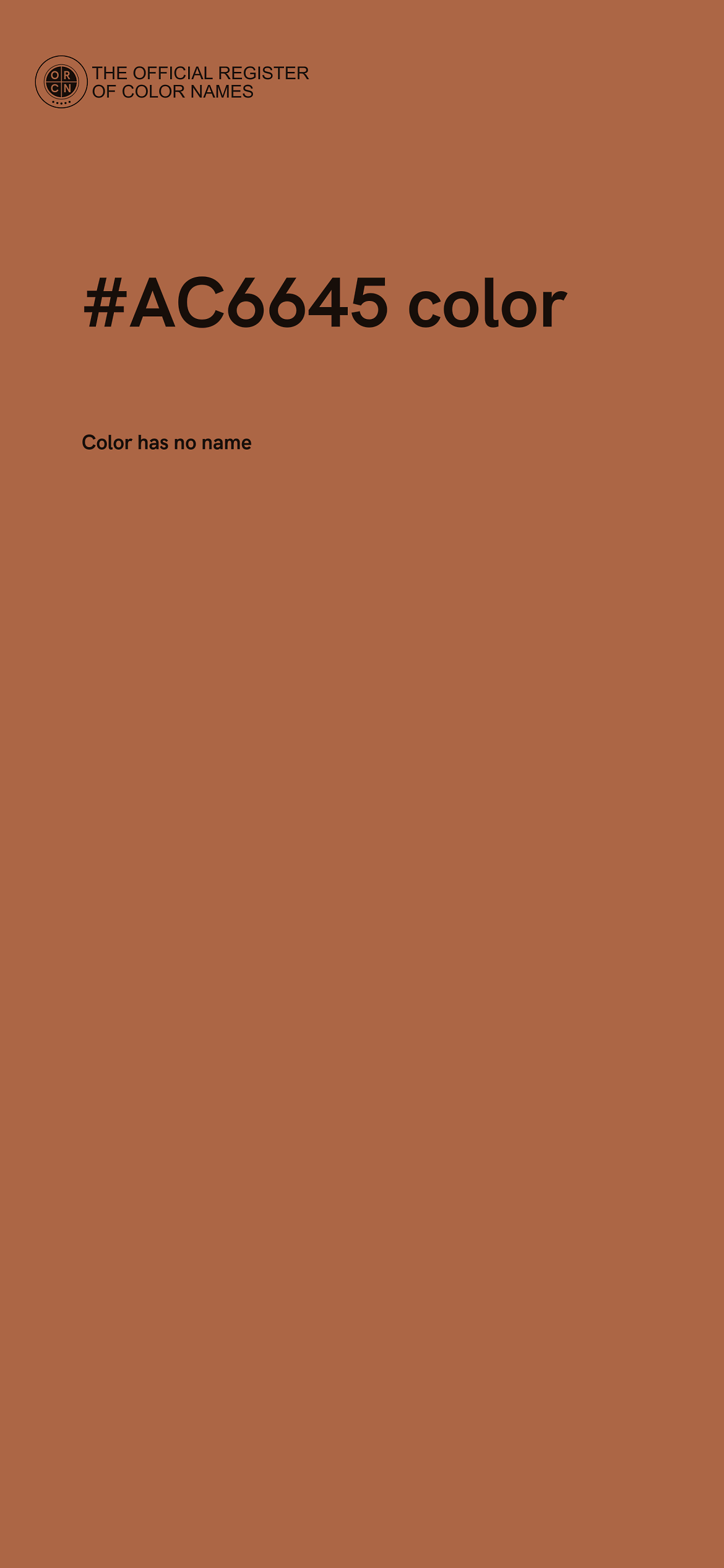 The digital color HEX #AC6645 belongs to the Orange Color Family featuring Moderate Saturation (Saturation Family) and Light (Brightness Family).