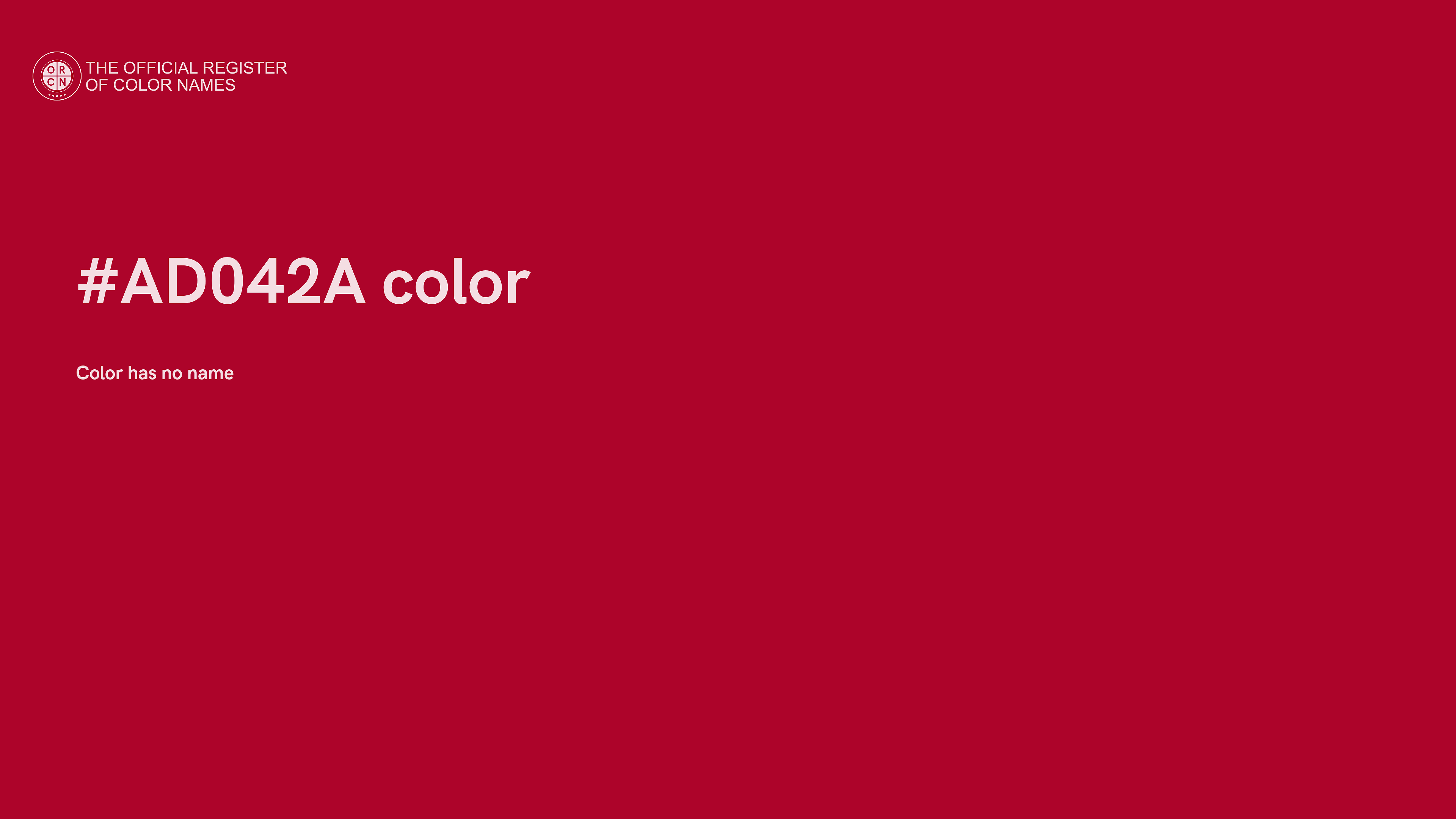 For printing in non digital world, #AD042A is represented in CMYK as 0 Cyan, 66 Magenta, 51 Yellow, and 32 Black (Key) (C:0 M:66 Y:51 K:32).