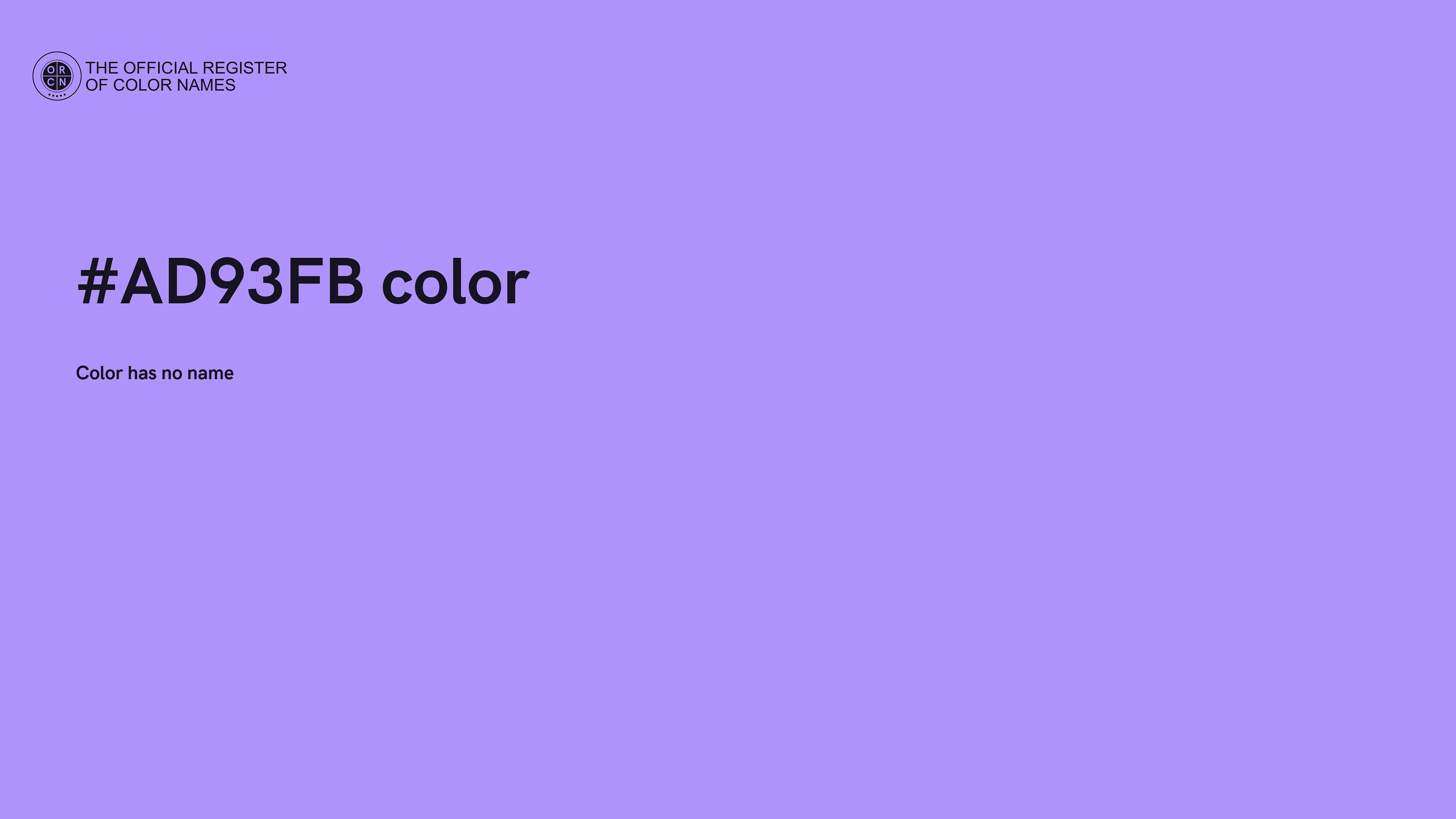 The digital color HEX #AD93FB belongs to the Violet Color Family featuring Full Saturation (Saturation Family) and Very Light (Brightness Family).