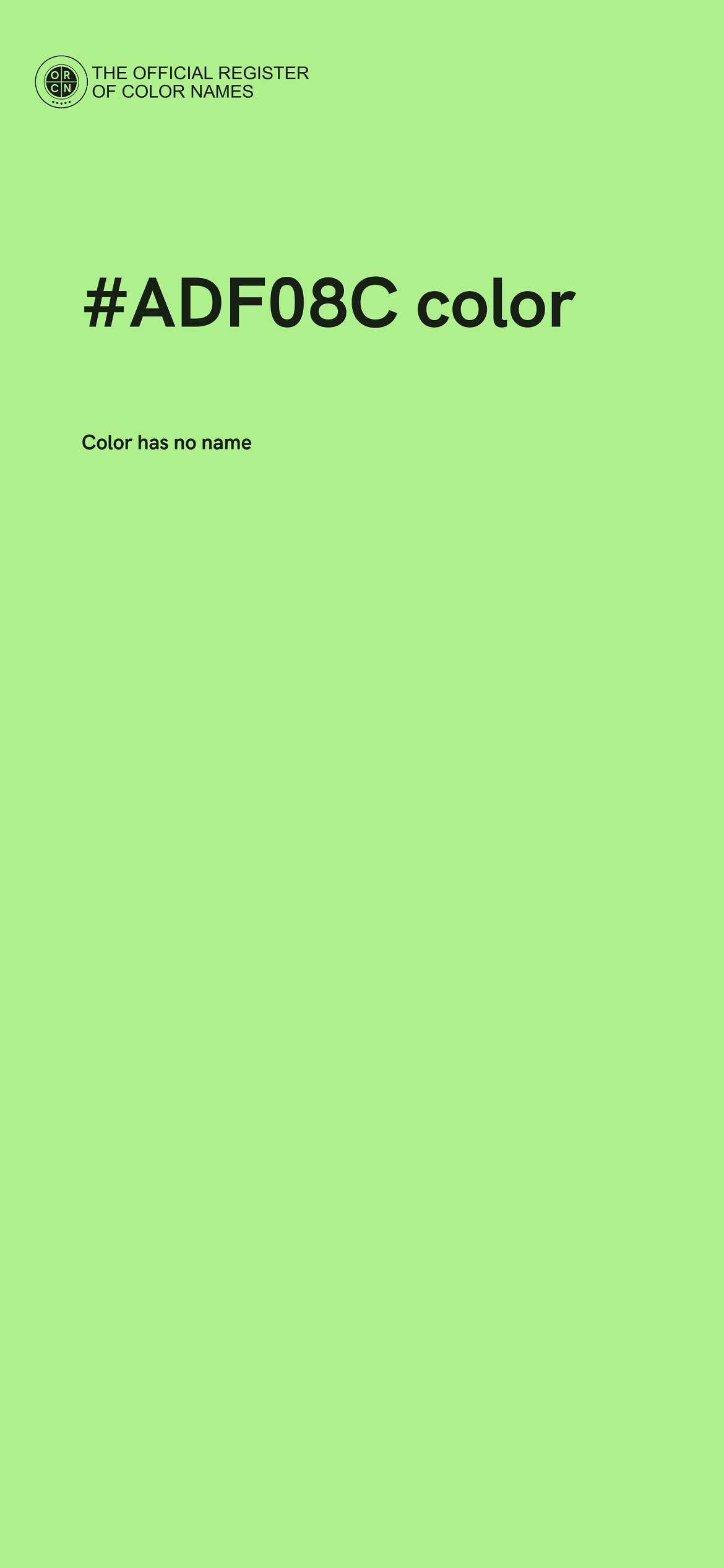 The digital color HEX #ADF08C belongs to the Chartreuse Color Family featuring High Saturation (Saturation Family) and Very Light (Brightness Family).