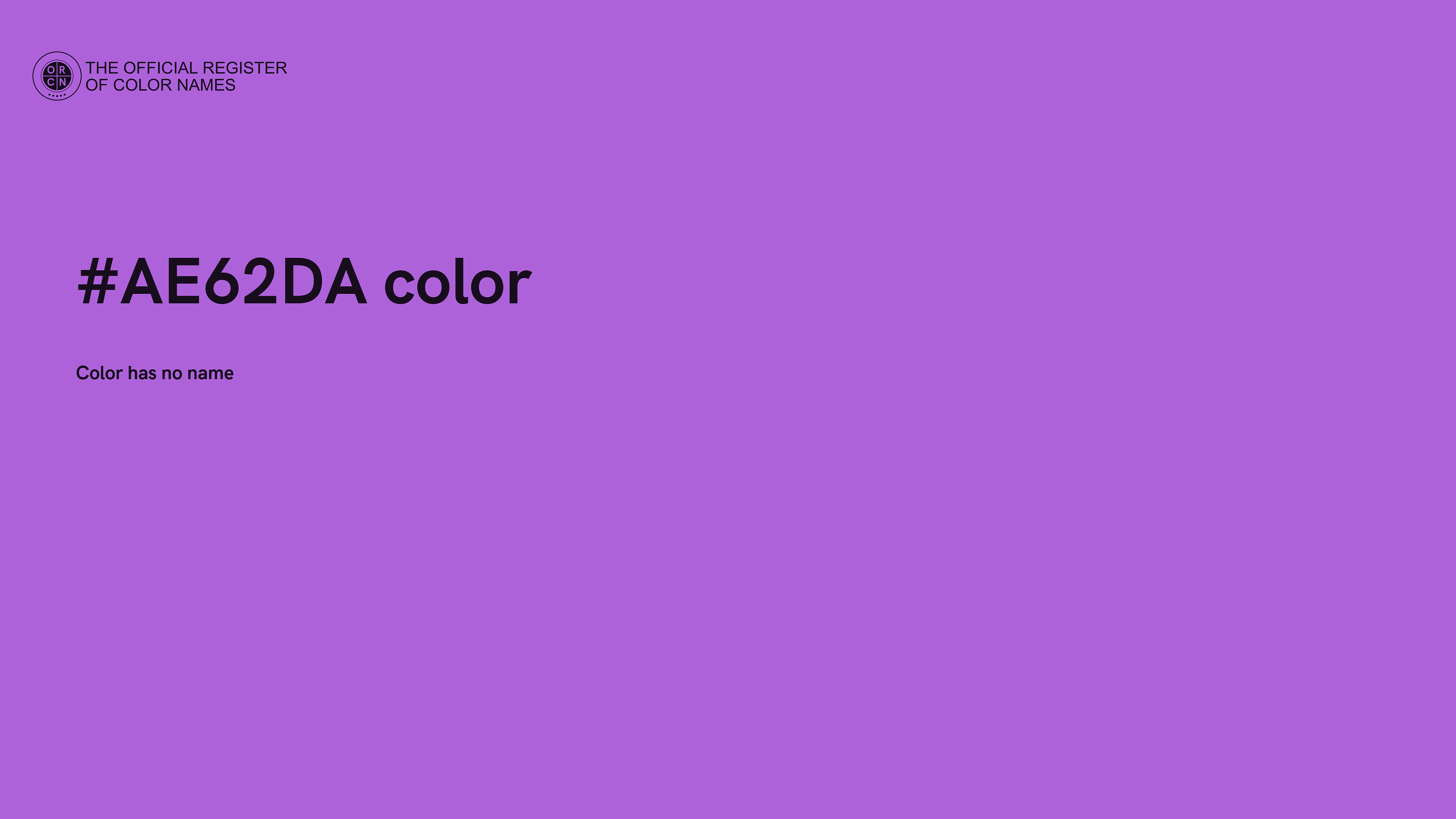 HEX code #AE62DA represent the color in hexadecimal format by combining three values – the amounts of Red, Green and Blue (RGB). Its RGB composition is 174, 98, 218 ( rgb(174, 98, 218) ), which breaks down into 68.2% of Red, 38.4% Green and 85.5% Blue.