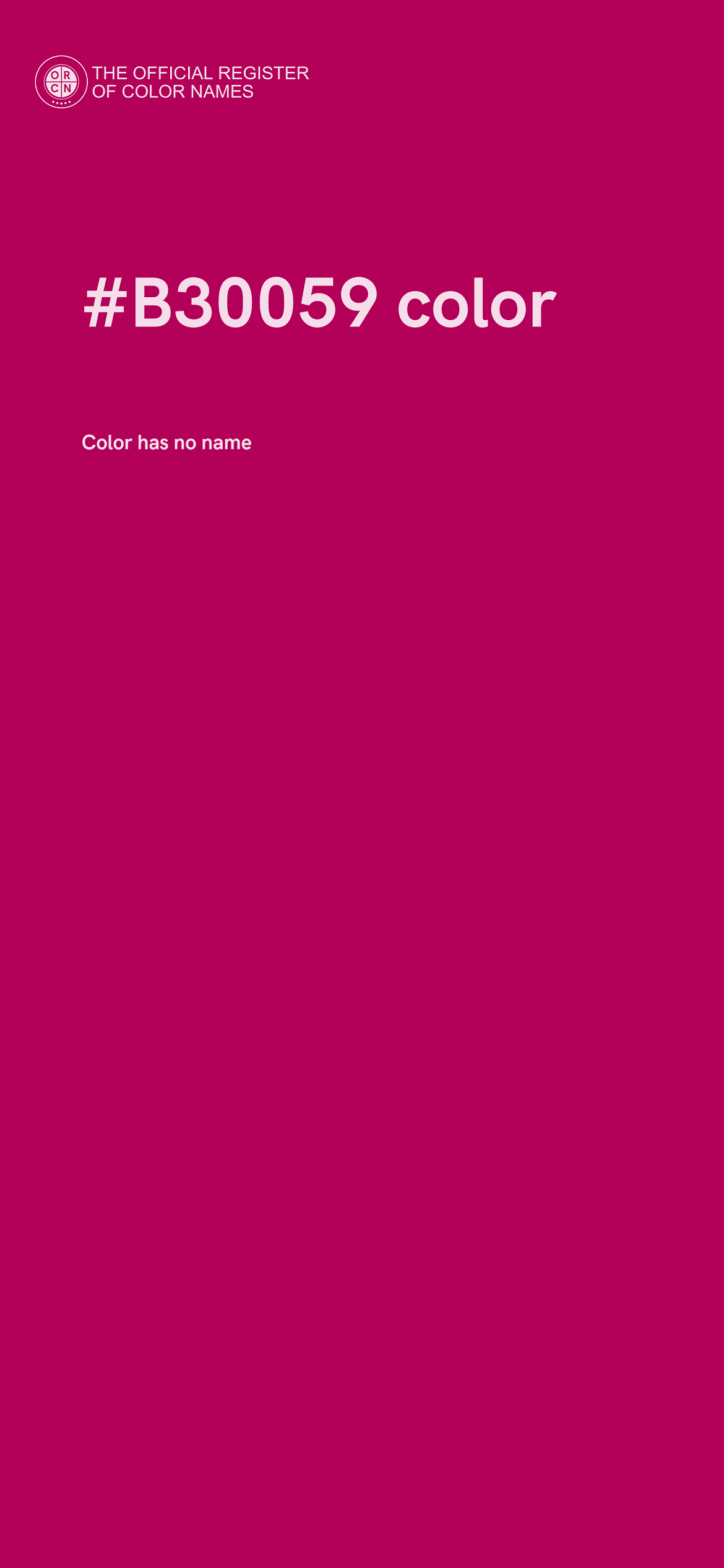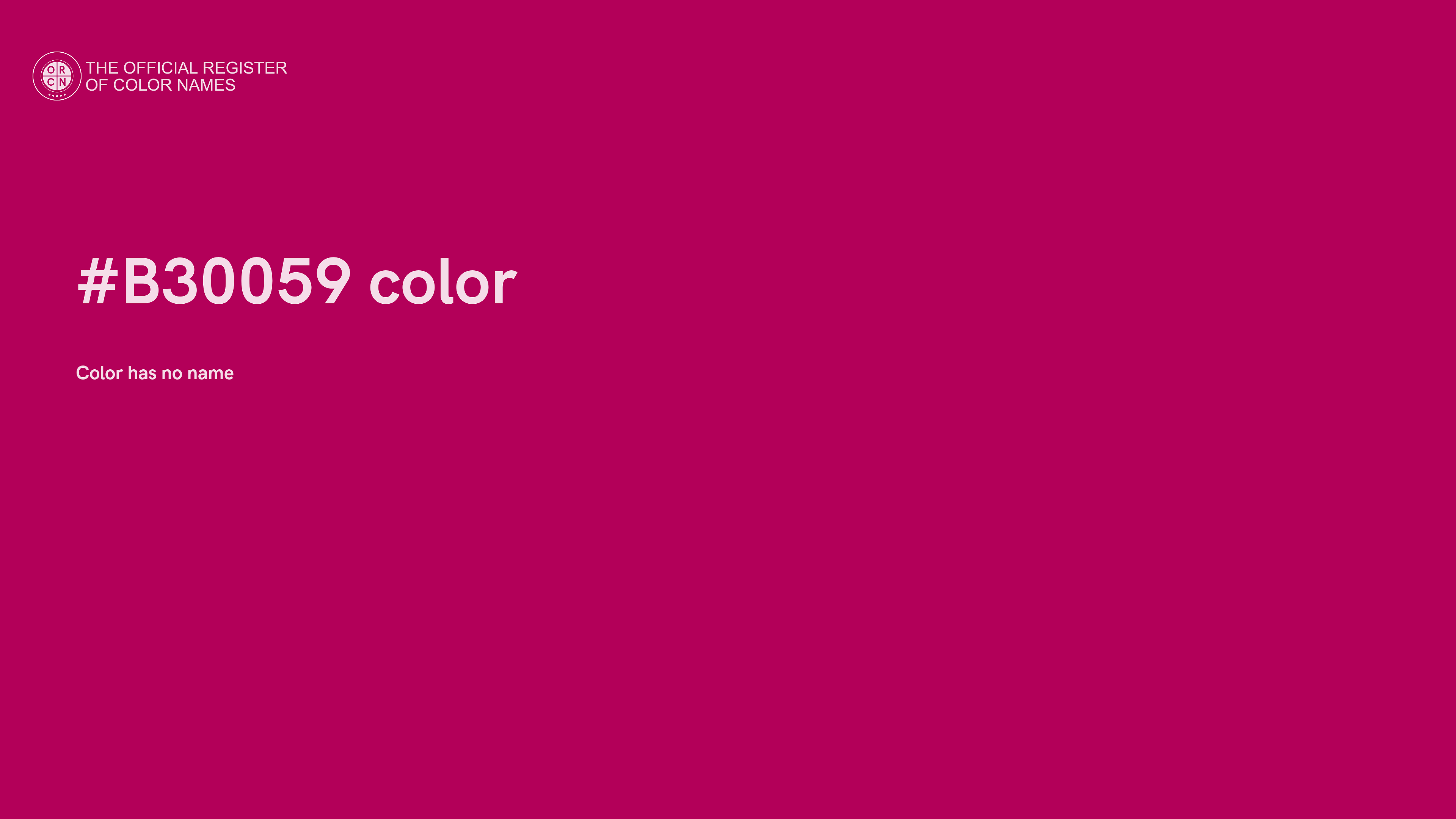 The digital color HEX #B30059 belongs to the Rose Color Family featuring Full Saturation (Saturation Family) and Neutral (Brightness Family).