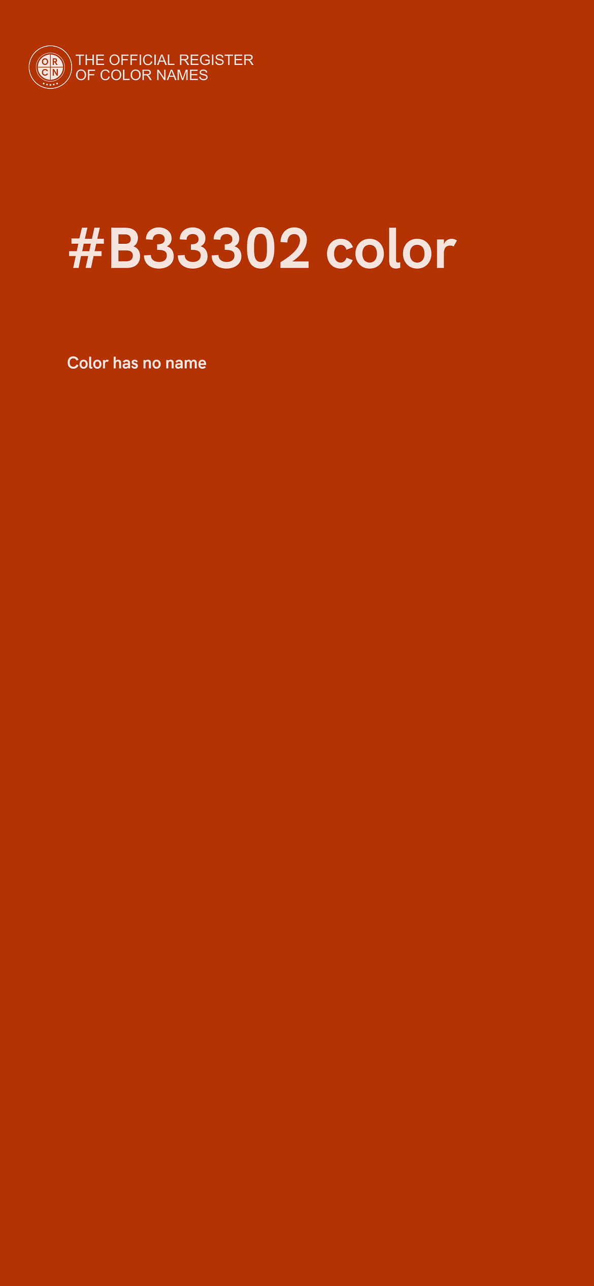 HEX code #B33302 represent the color in hexadecimal format by combining three values – the amounts of Red, Green and Blue (RGB). Its RGB composition is 179, 51, 2 ( rgb(179, 51, 2) ), which breaks down into 70.2% of Red, 20% Green and 0.8% Blue.