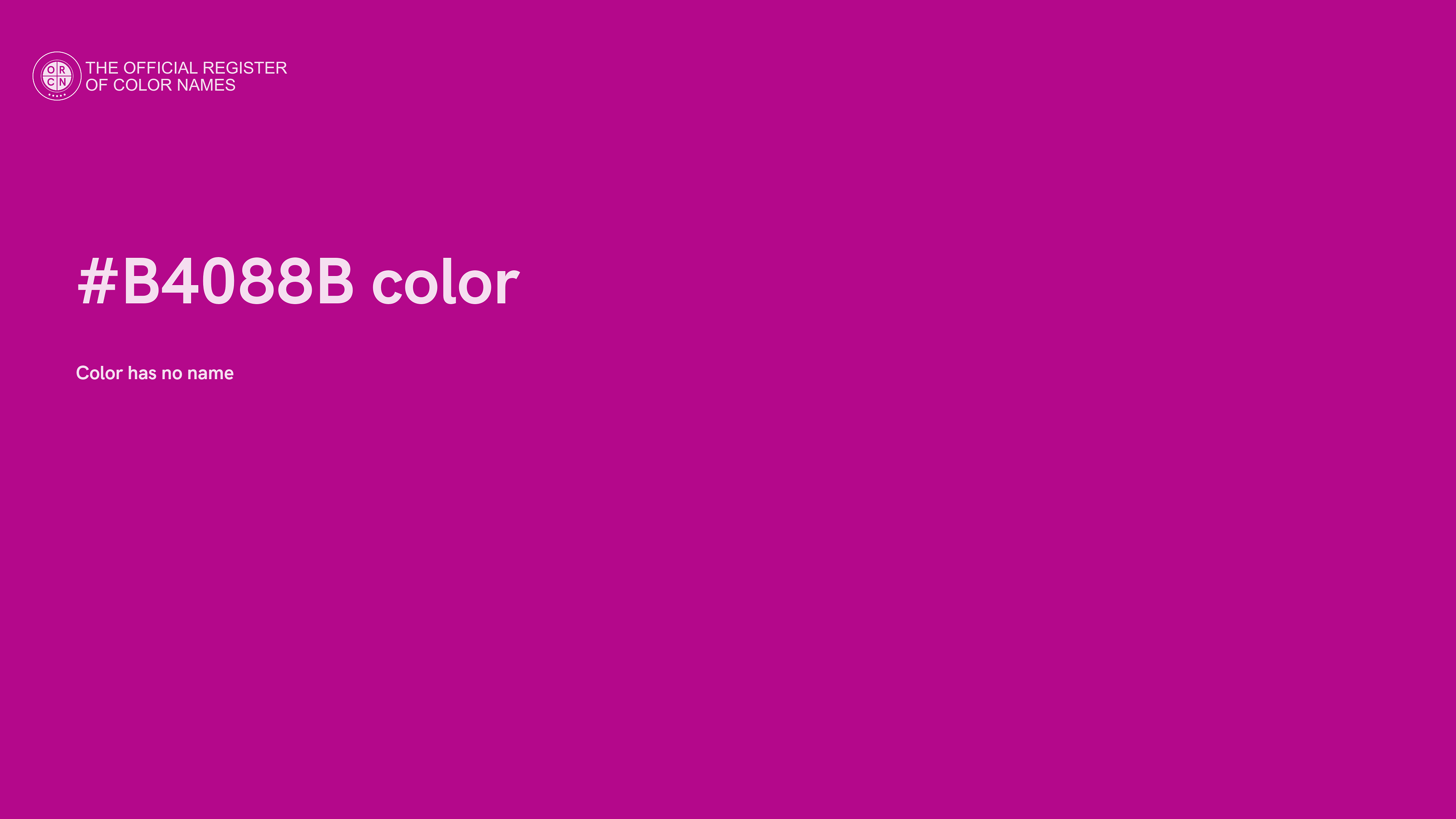 The digital color HEX #B4088B belongs to the Magenta Color Family featuring Full Saturation (Saturation Family) and Neutral (Brightness Family).