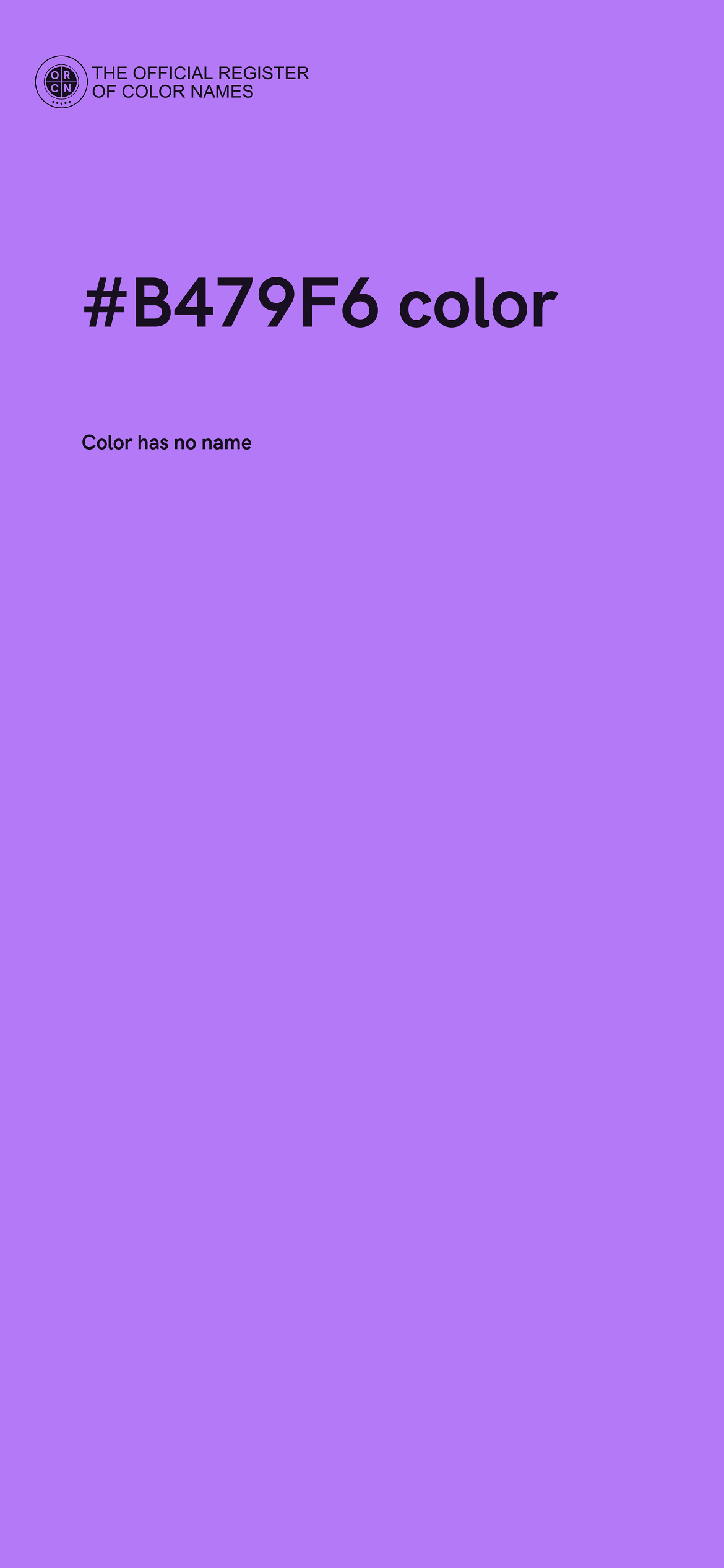 For printing in non digital world, #B479F6 is represented in CMYK as 26 Cyan, 49 Magenta, 0 Yellow, and 4 Black (Key) (C:26 M:49 Y:0 K:4).