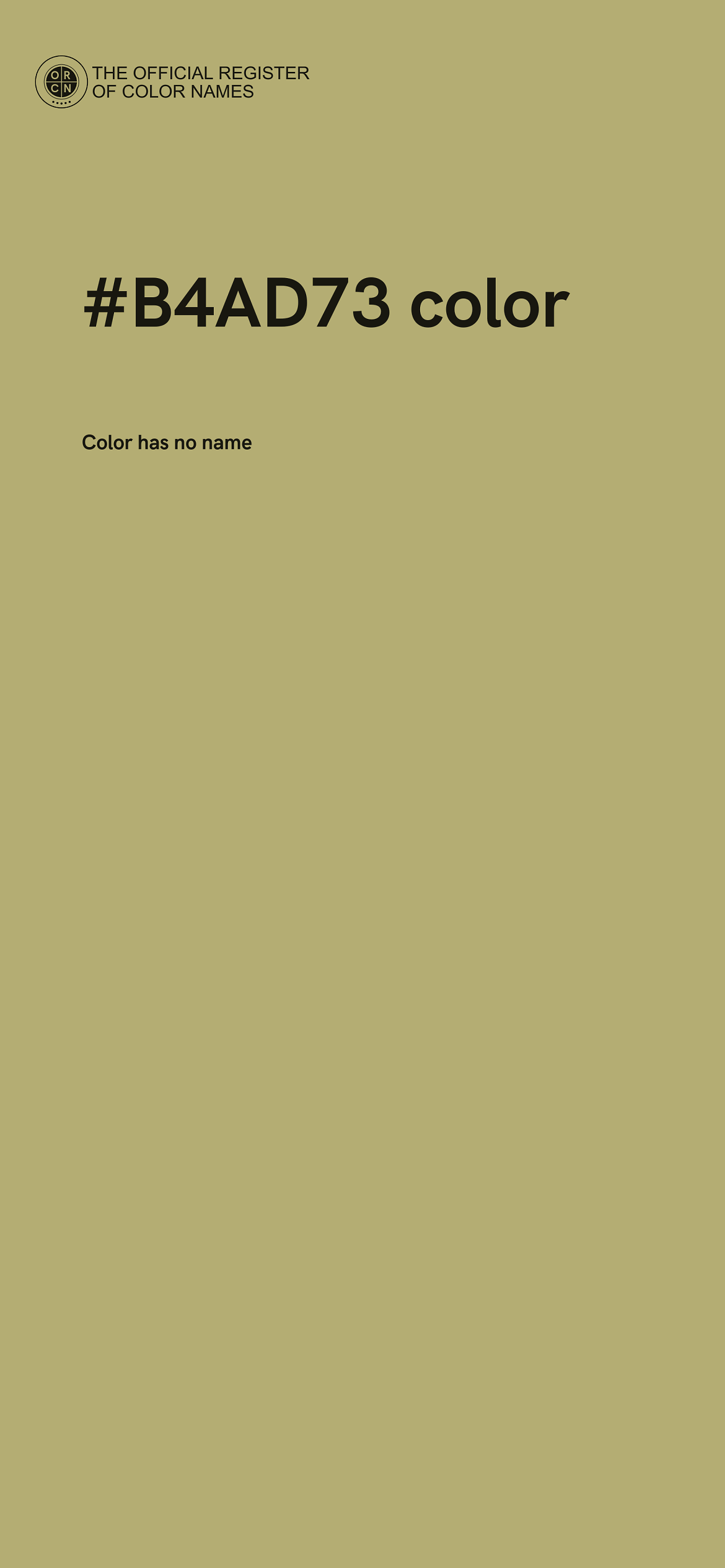 For printing in non digital world, #B4AD73 is represented in CMYK as 0 Cyan, 3 Magenta, 25 Yellow, and 29 Black (Key) (C:0 M:3 Y:25 K:29).