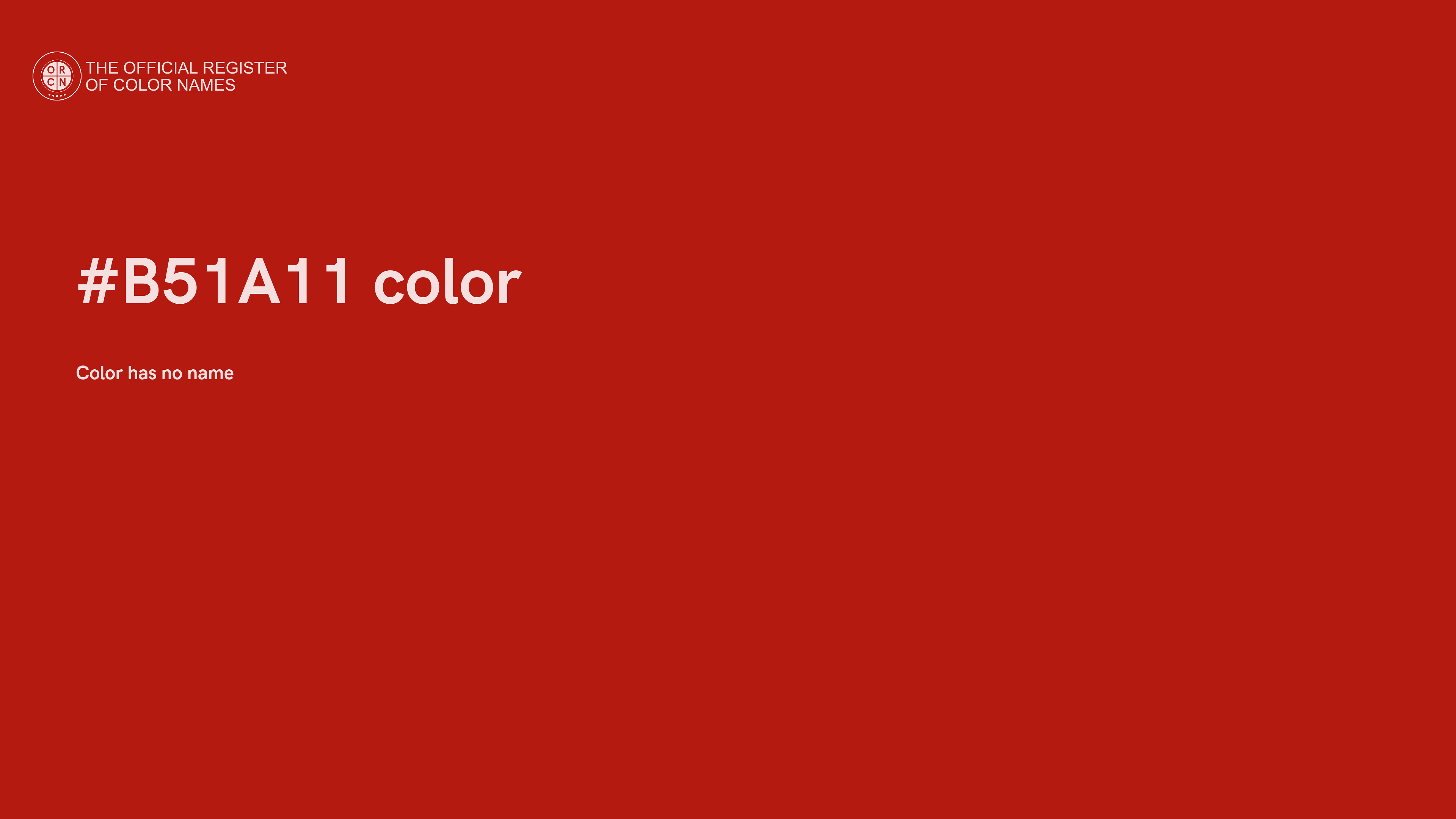 The digital color HEX #B51A11 belongs to the Red Color Family featuring High Saturation (Saturation Family) and Neutral (Brightness Family).