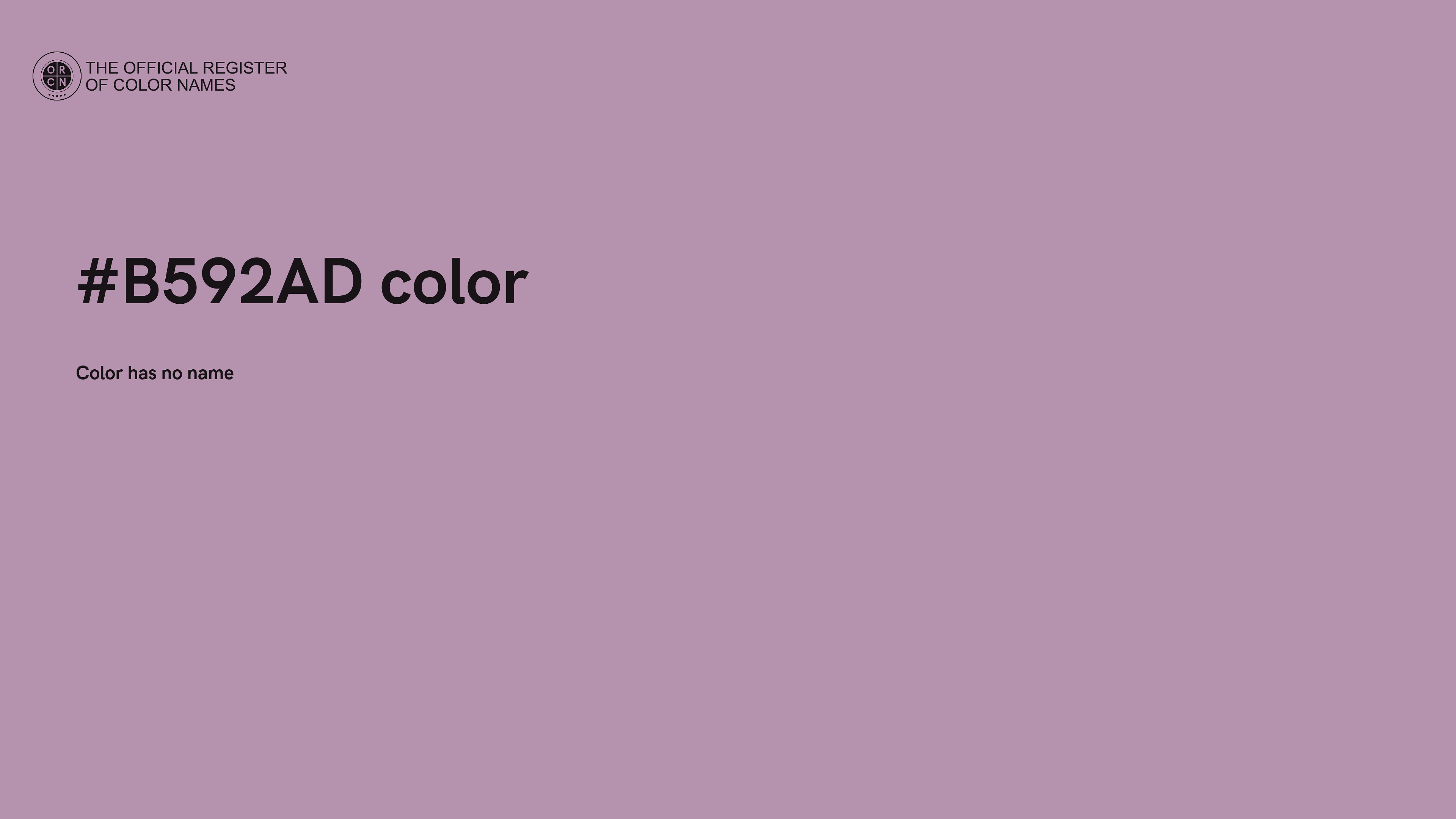 The digital color HEX #B592AD belongs to the Magenta Color Family featuring Low Saturation (Saturation Family) and Very Light (Brightness Family).