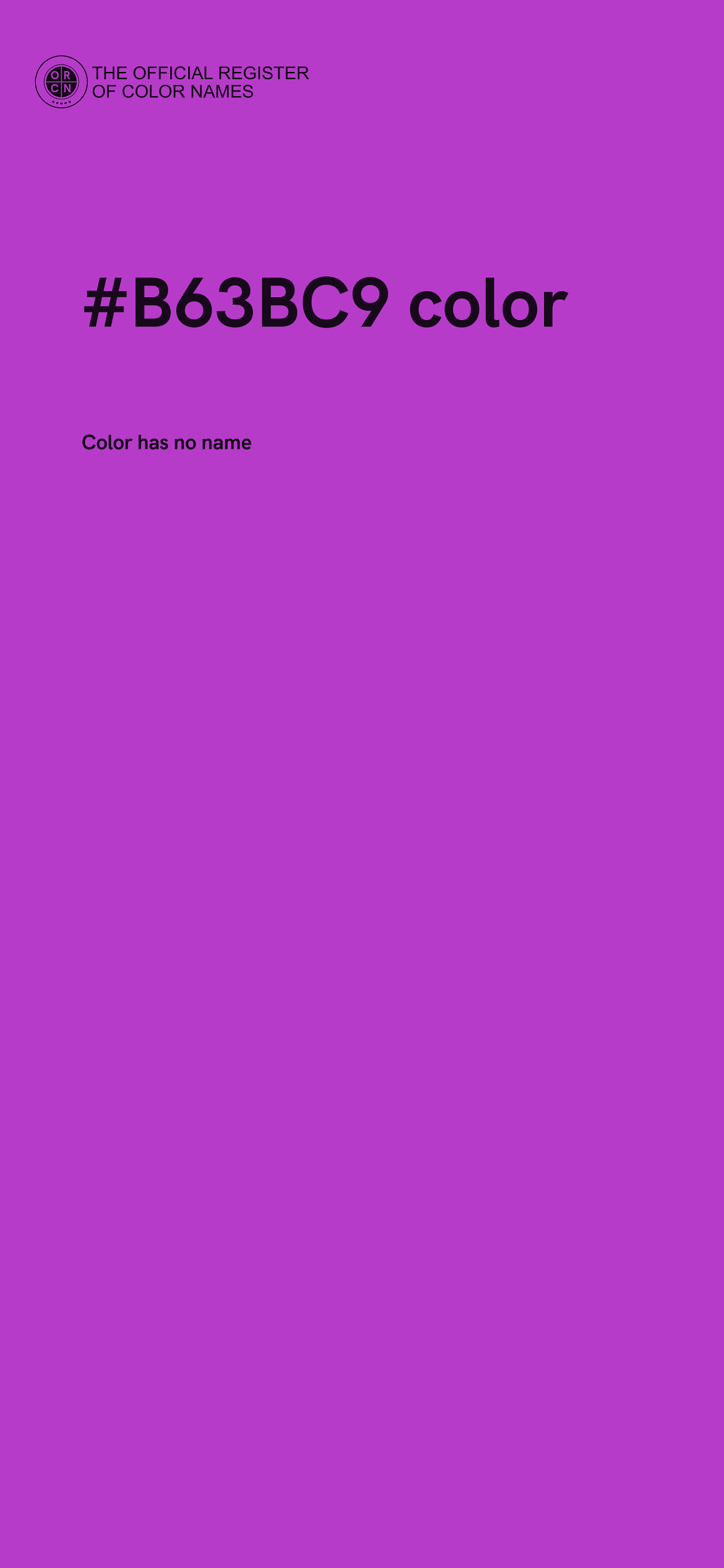 HEX code #B63BC9 represent the color in hexadecimal format by combining three values – the amounts of Red, Green and Blue (RGB). Its RGB composition is 182, 59, 201 ( rgb(182, 59, 201) ), which breaks down into 71.4% of Red, 23.1% Green and 78.8% Blue.