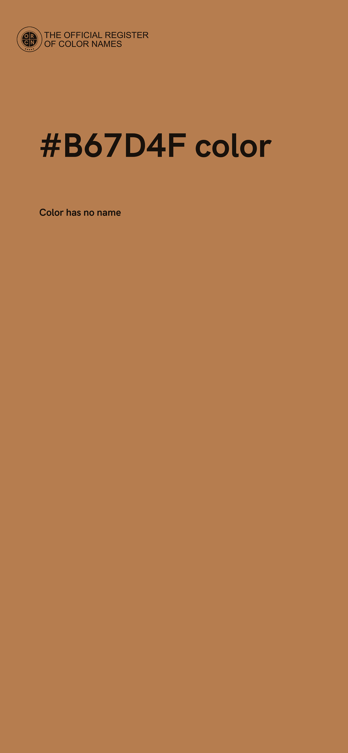 The digital color HEX #B67D4F belongs to the Orange Color Family featuring Moderate Saturation (Saturation Family) and Light (Brightness Family).