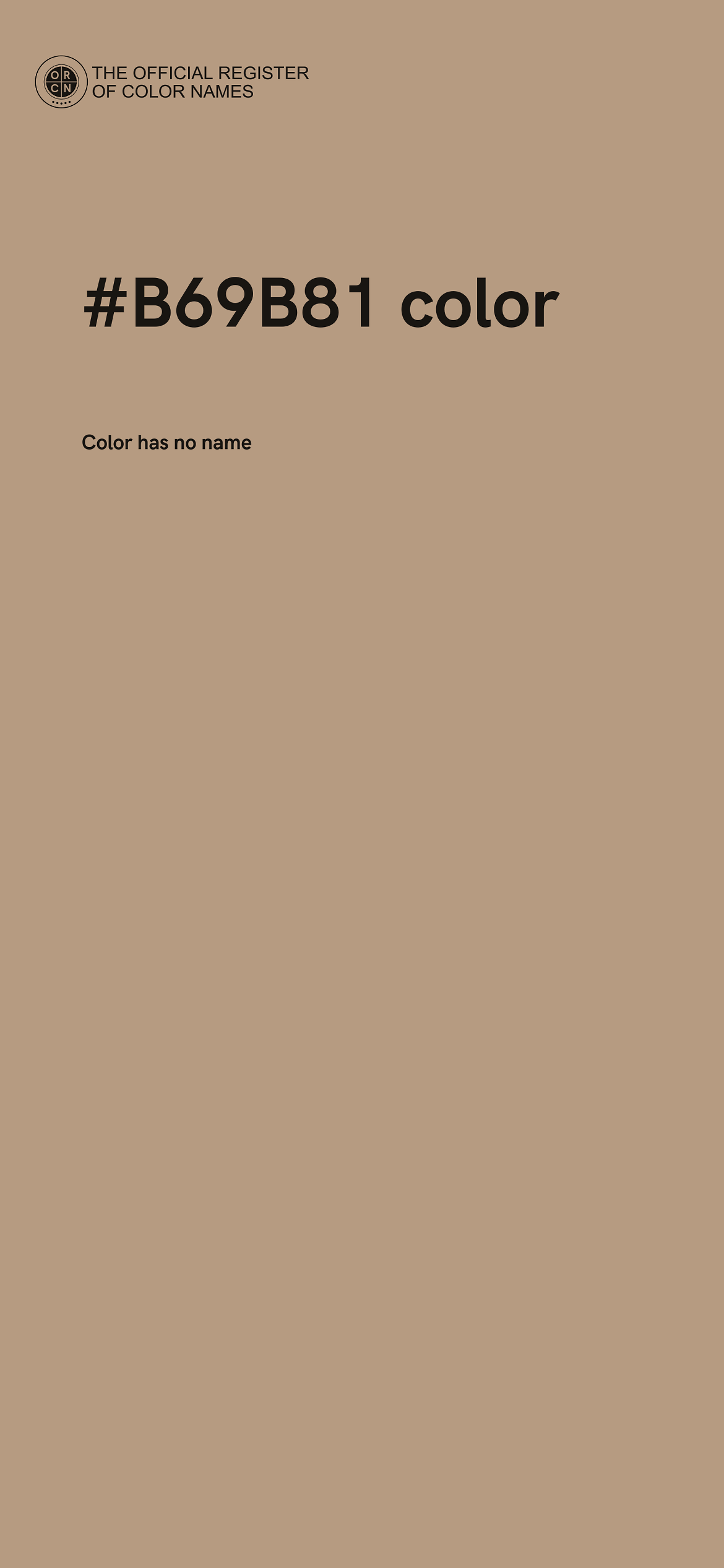 The digital color HEX #B69B81 belongs to the Orange Color Family featuring Mild Saturation (Saturation Family) and Very Light (Brightness Family).