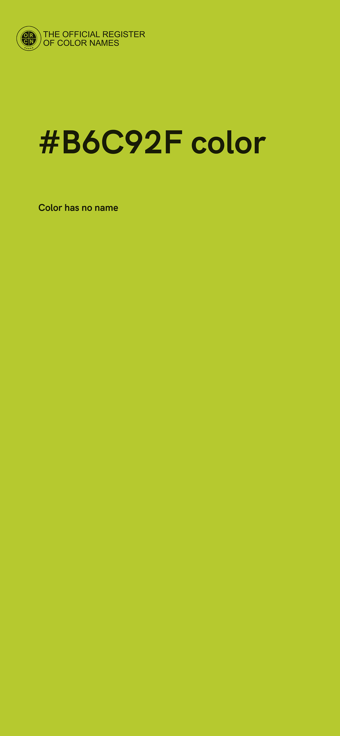 The digital color HEX #B6C92F belongs to the Yellow Color Family featuring High Saturation (Saturation Family) and Light (Brightness Family).