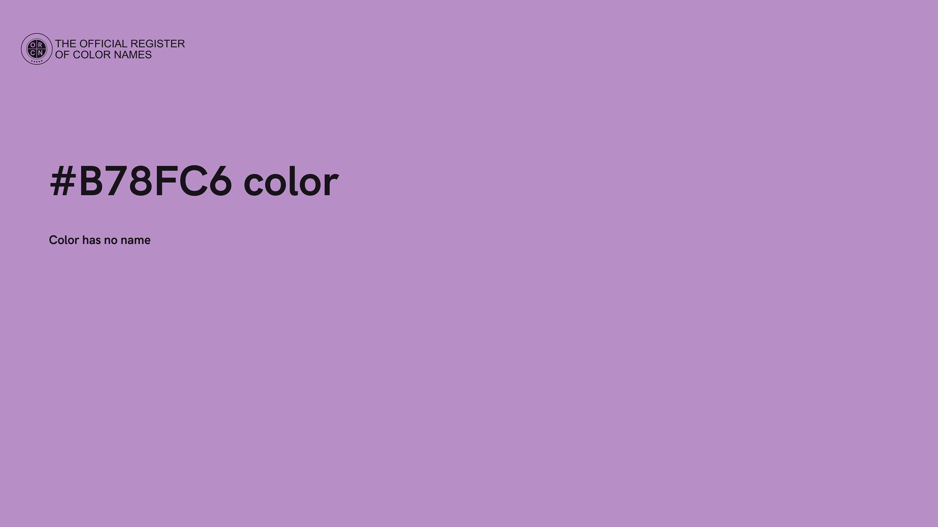 The digital color HEX #B78FC6 belongs to the Violet Color Family featuring Mild Saturation (Saturation Family) and Very Light (Brightness Family).