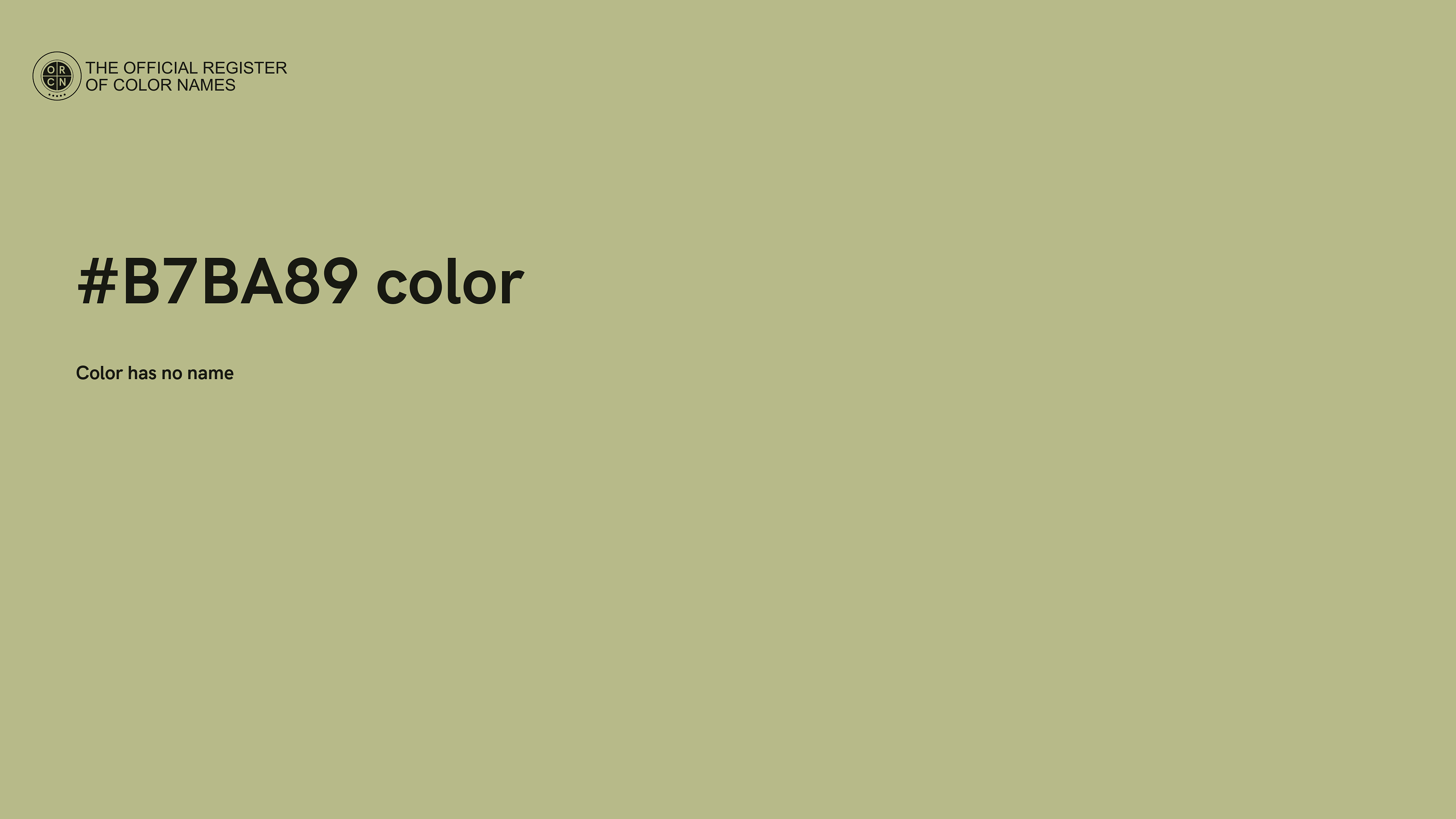 For printing in non digital world, #B7BA89 is represented in CMYK as 1 Cyan, 0 Magenta, 19 Yellow, and 27 Black (Key) (C:1 M:0 Y:19 K:27).