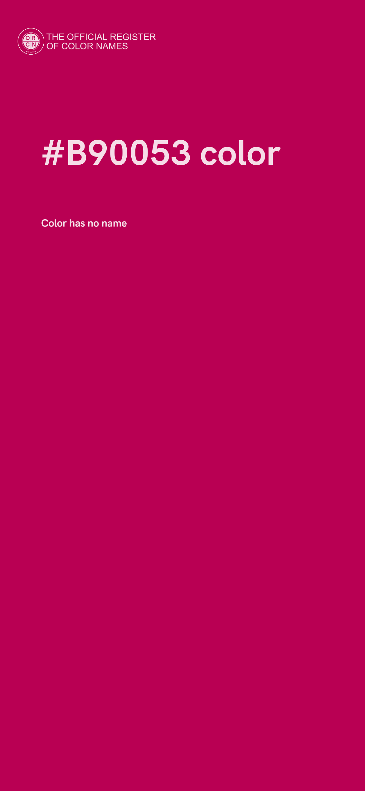 The digital color HEX #B90053 belongs to the Rose Color Family featuring Full Saturation (Saturation Family) and Neutral (Brightness Family).