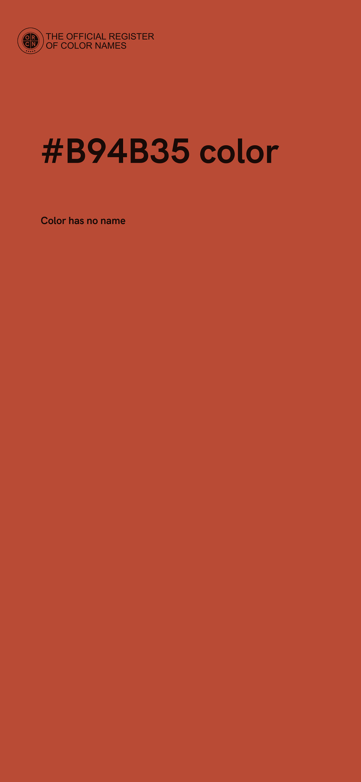 For printing in non digital world, #B94B35 is represented in CMYK as 0 Cyan, 43 Magenta, 52 Yellow, and 27 Black (Key) (C:0 M:43 Y:52 K:27).