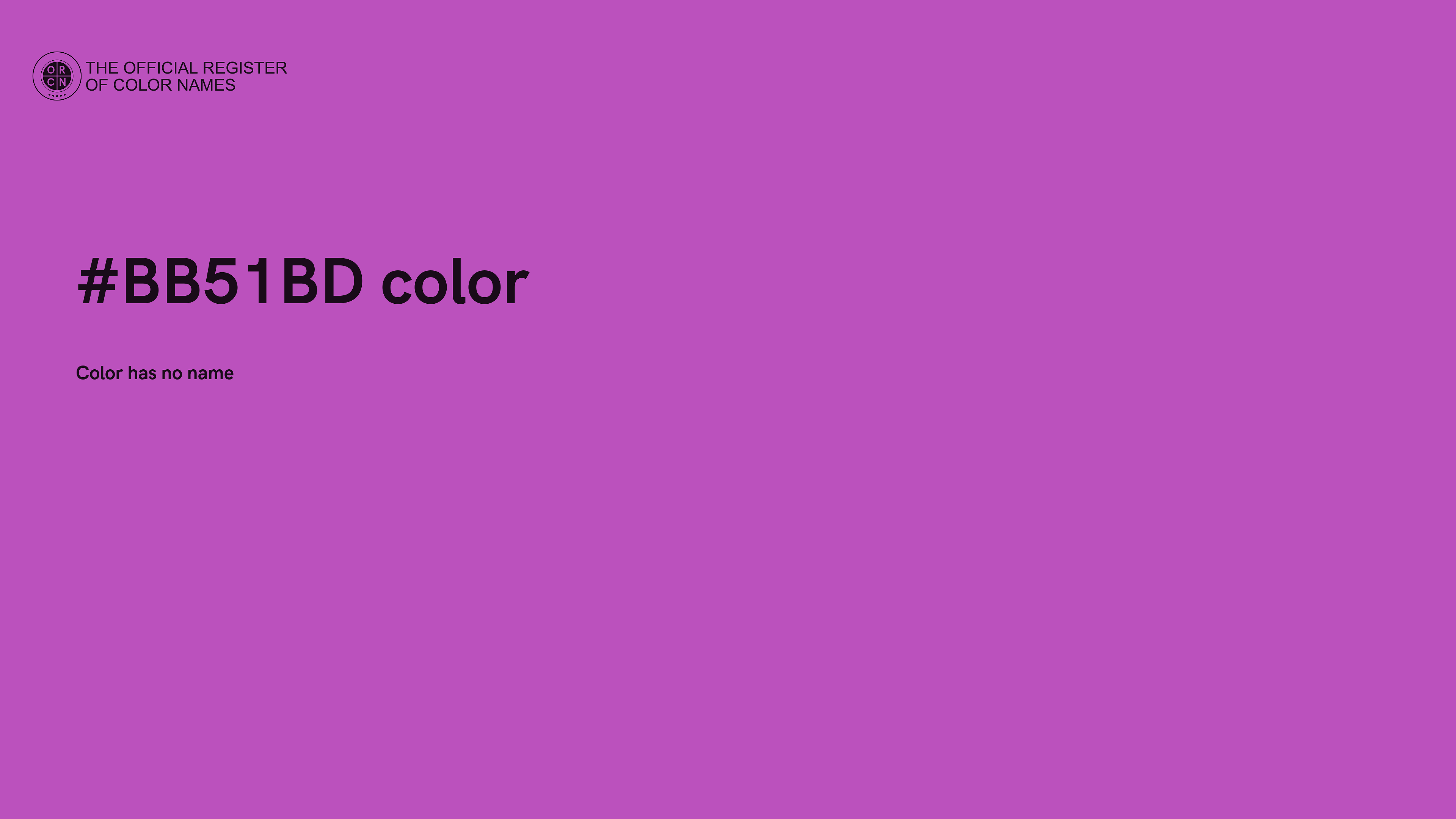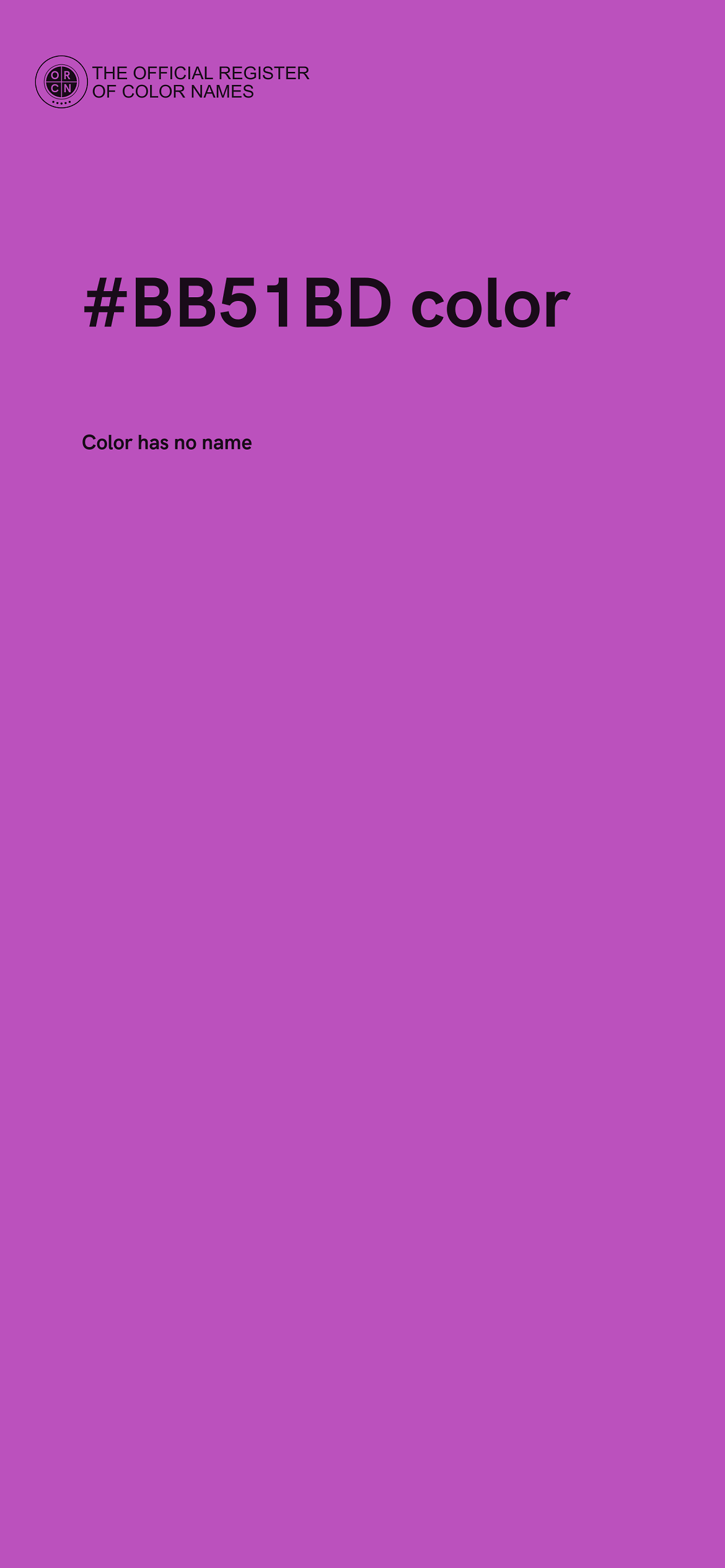 For printing in non digital world, #BB51BD is represented in CMYK as 1 Cyan, 42 Magenta, 0 Yellow, and 26 Black (Key) (C:1 M:42 Y:0 K:26).