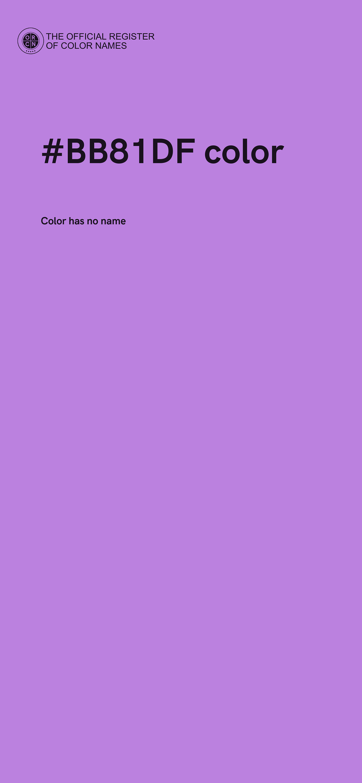 The digital color HEX #BB81DF belongs to the Violet Color Family featuring Moderate Saturation (Saturation Family) and Very Light (Brightness Family).