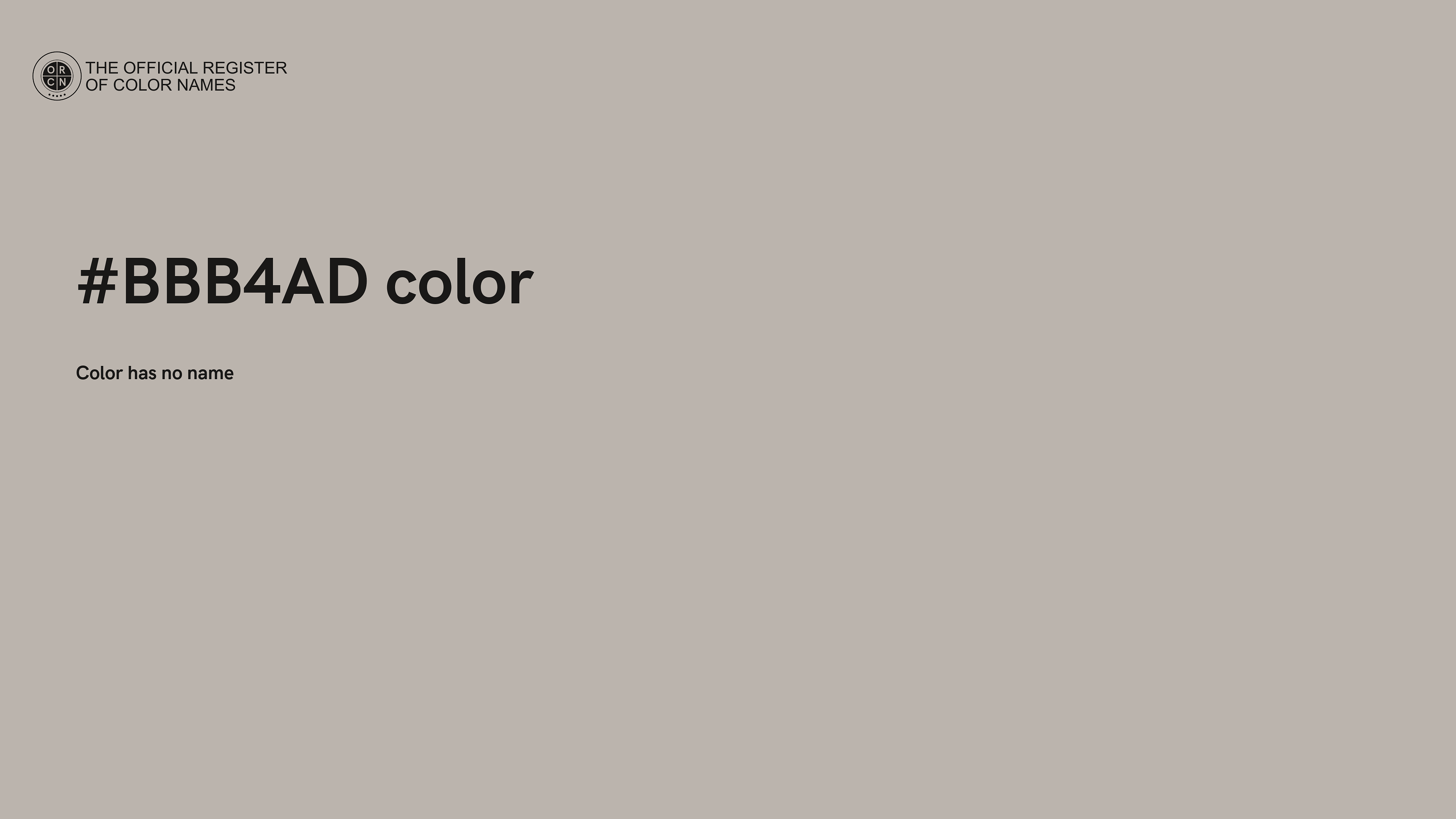 The digital color HEX #BBB4AD belongs to the Orange Color Family featuring Desaturated (Saturation Family) and Very Light (Brightness Family).