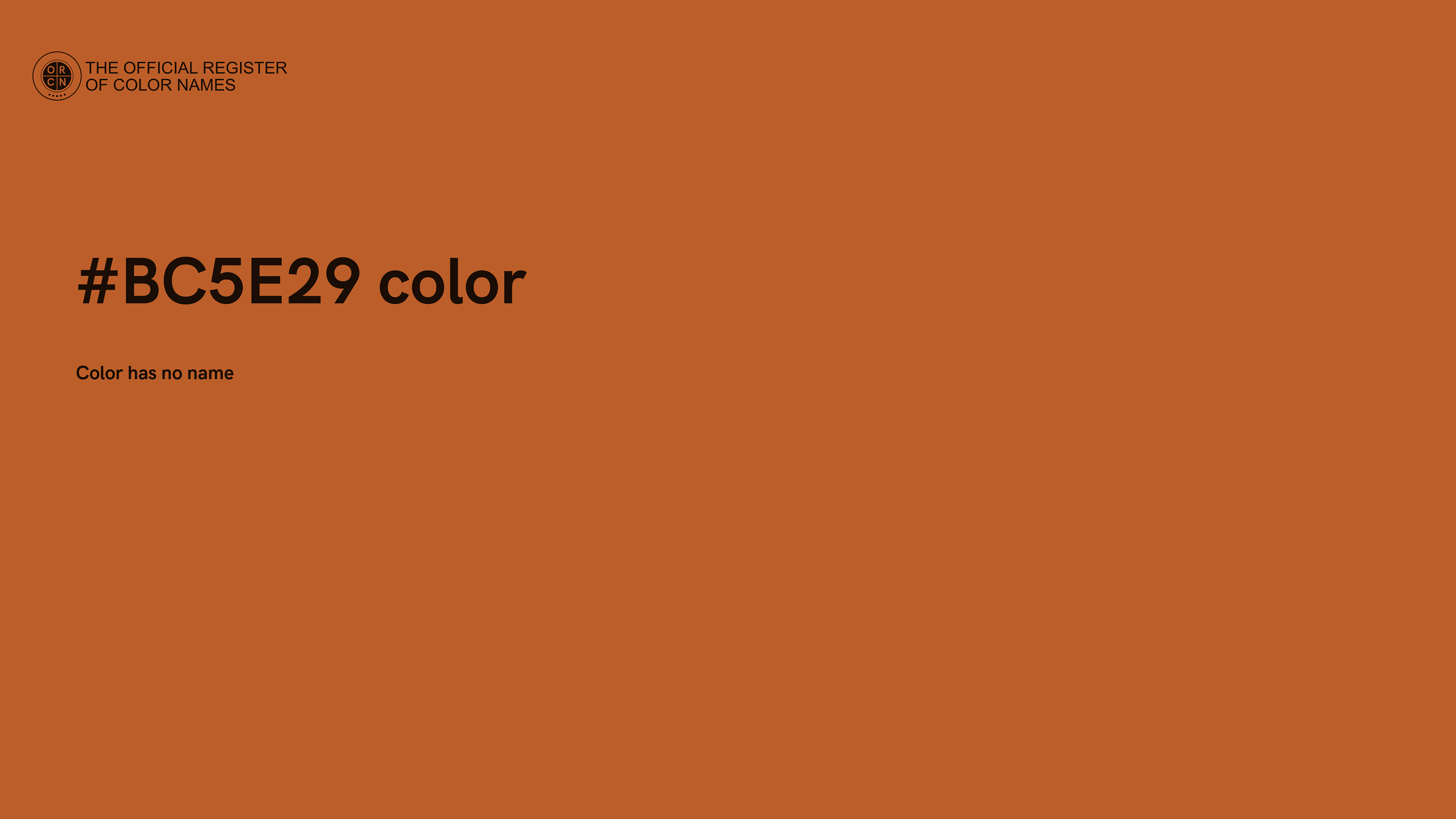 The digital color HEX #BC5E29 belongs to the Orange Color Family featuring High Saturation (Saturation Family) and Light (Brightness Family).