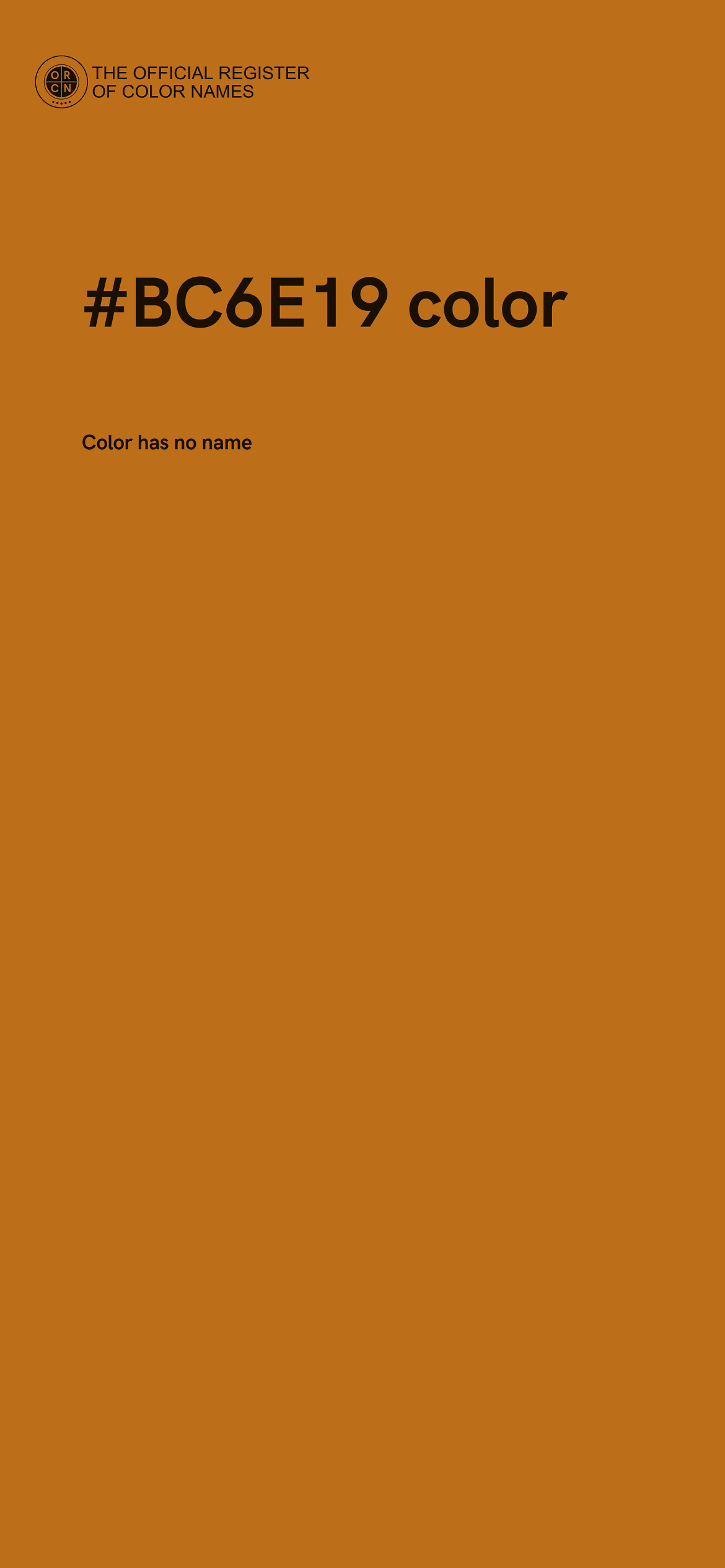 The digital color HEX #BC6E19 belongs to the Orange Color Family featuring High Saturation (Saturation Family) and Light (Brightness Family).