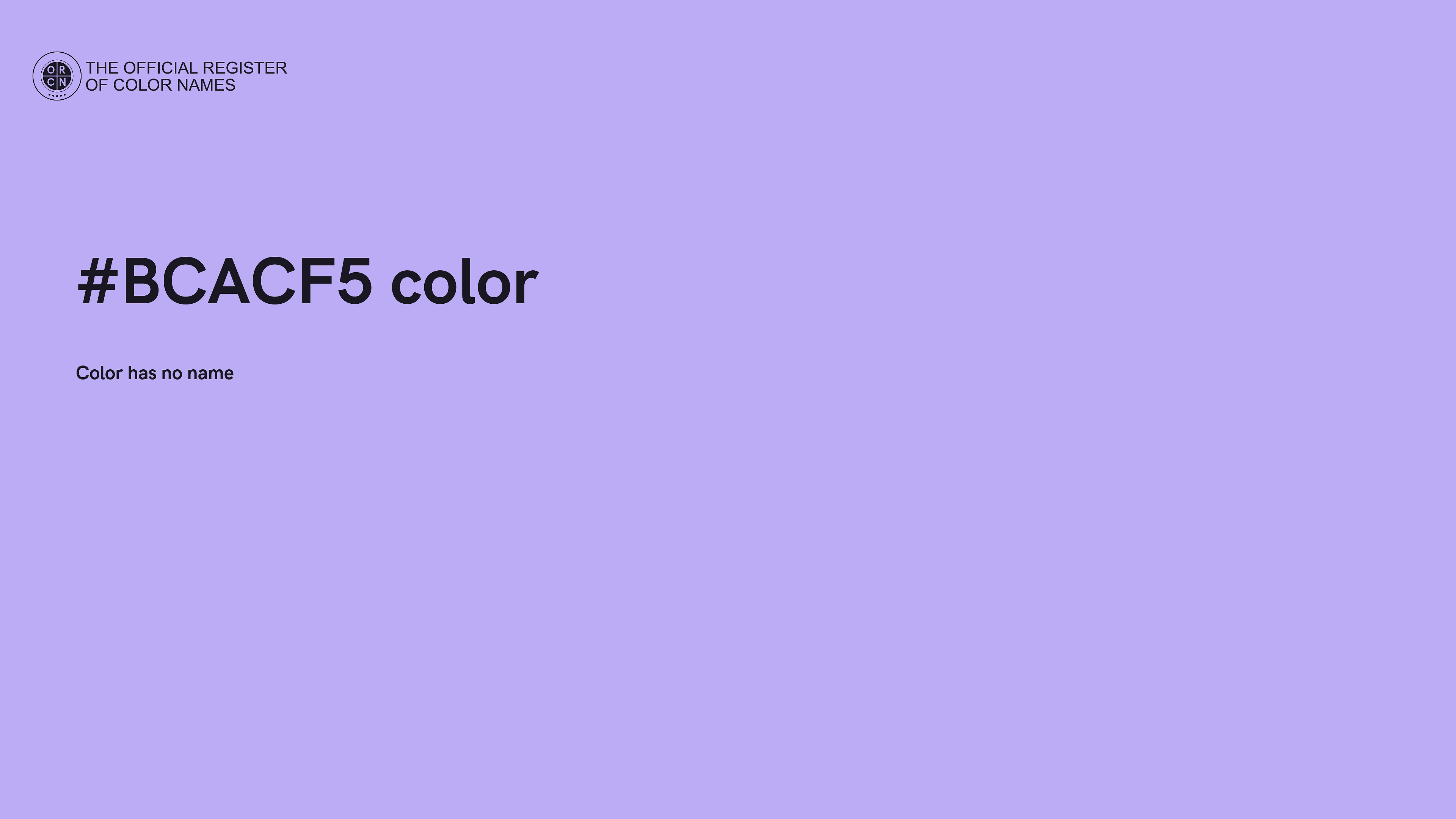 For printing in non digital world, #BCACF5 is represented in CMYK as 22 Cyan, 29 Magenta, 0 Yellow, and 4 Black (Key) (C:22 M:29 Y:0 K:4).