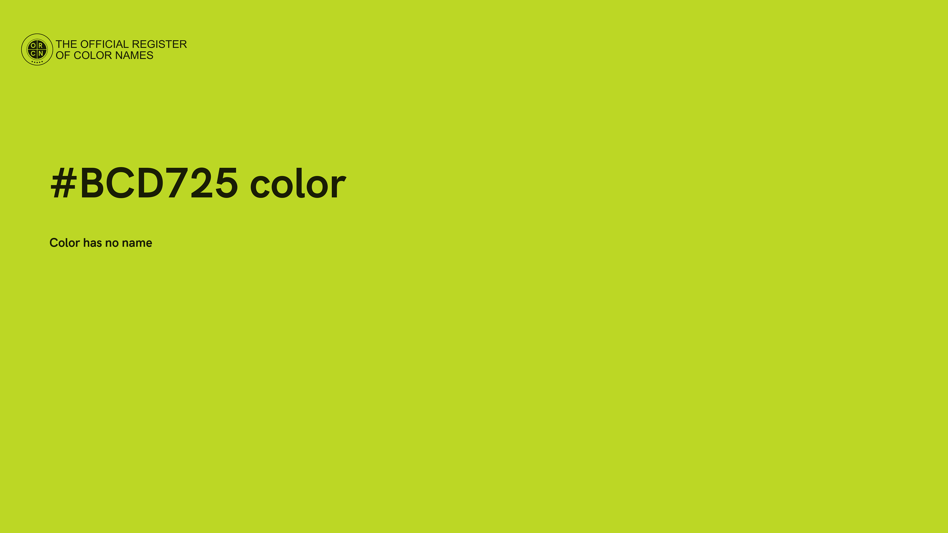 For printing in non digital world, #BCD725 is represented in CMYK as 11 Cyan, 0 Magenta, 70 Yellow, and 16 Black (Key) (C:11 M:0 Y:70 K:16).