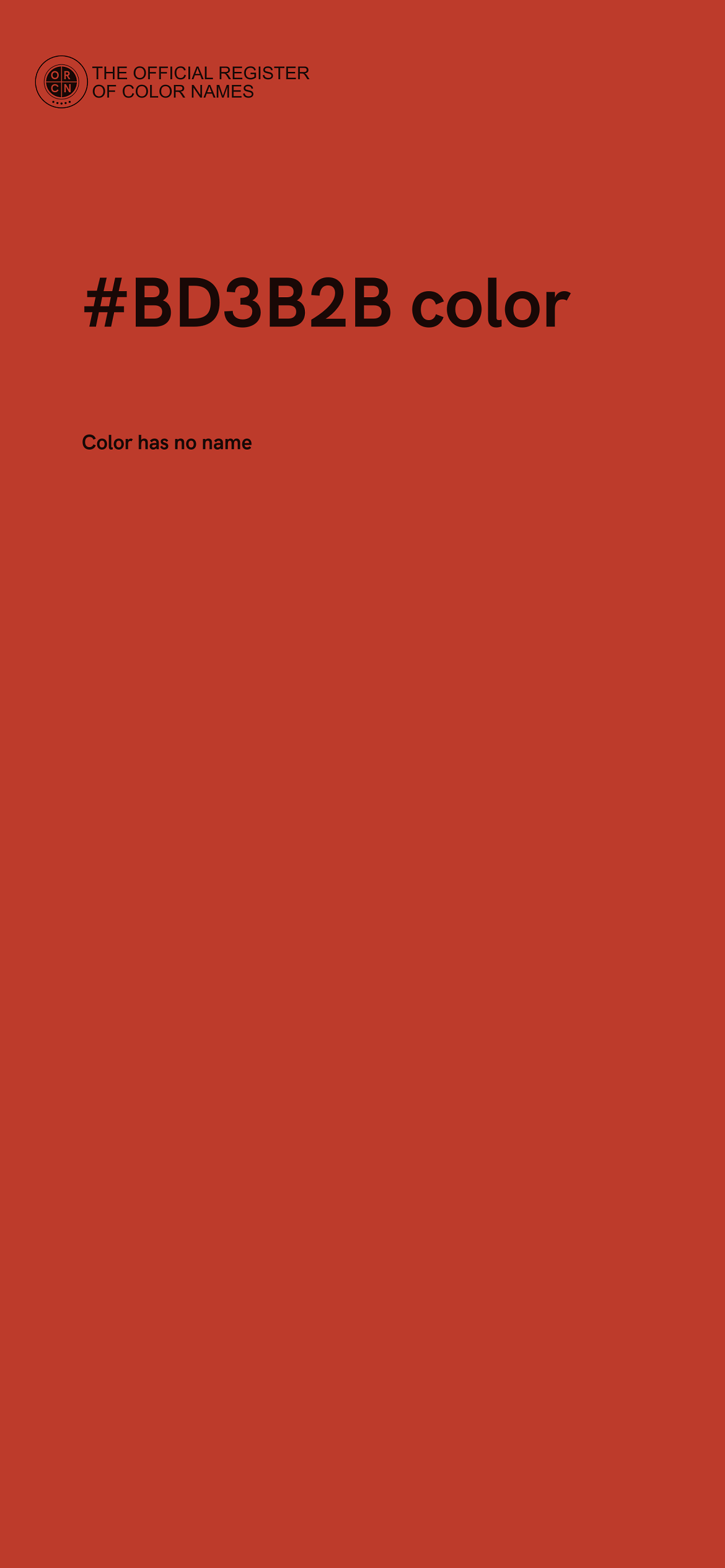 For printing in non digital world, #BD3B2B is represented in CMYK as 0 Cyan, 51 Magenta, 57 Yellow, and 26 Black (Key) (C:0 M:51 Y:57 K:26).