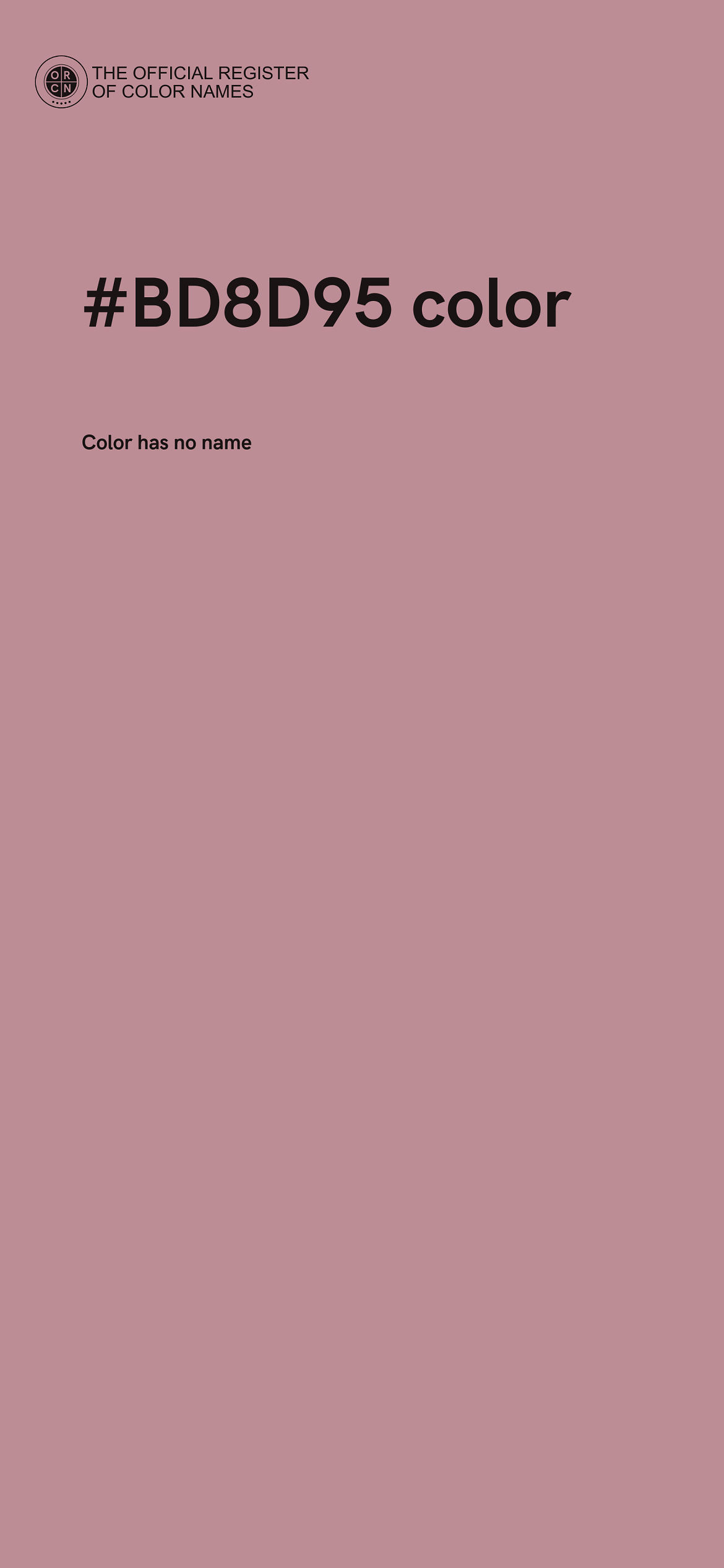 The digital color HEX #BD8D95 belongs to the Red Color Family featuring Mild Saturation (Saturation Family) and Very Light (Brightness Family).